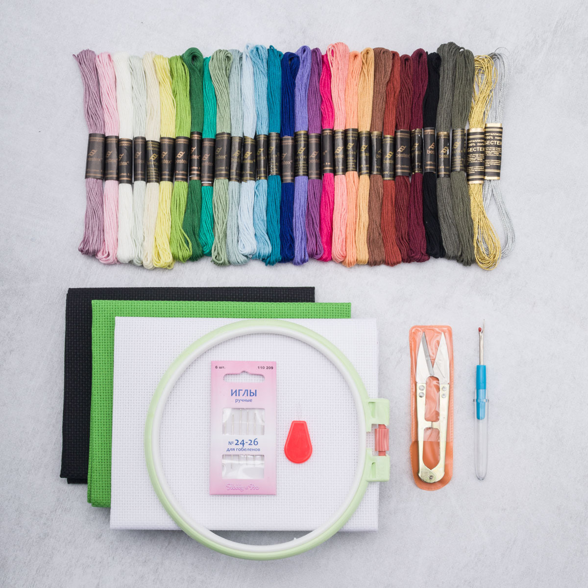 Набор для вышивки: мулине 30 цветов, канва, пяльцы, иглы, ножницы, вспарыватель, Bestex