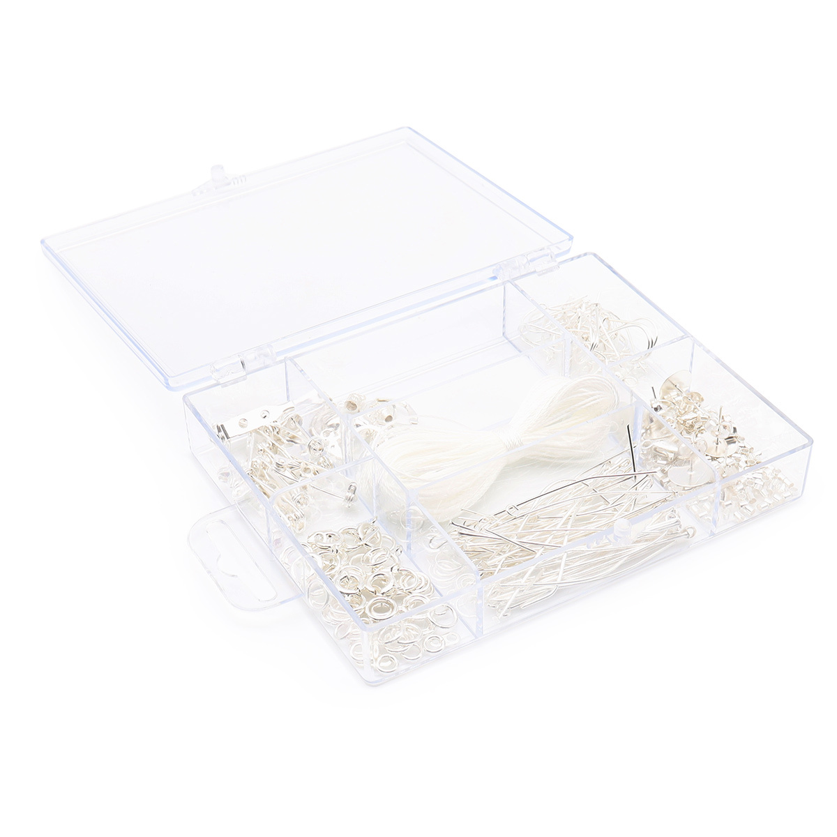 В этом наборе от Astra&Craft вы найдете необходимую фурнитуру для создания бижутерии, а также ремонта готовых украшений. Элементы из набора позволят вам решить разные задачи: – оформить удобную застежку для украшения, используя карабин или замок; – уплотнить конец ленты, шнура с помощью скуфейки или концевика; – создать серьги, используя швензы; – закрепить фурнитуру или украшения на изделии с помощью штифтов; – и многое другое. Фурнитура изготовлена из прочного металлического сплава, сохраняет цвет и не темнеет при длительном контакте с кожей. Все комплектующие упакованы в футляр с отсеками и крышкой, поэтому их удобно хранить. В наборе: карабины, швензы для сережек, булавки для брошей, замки для бижутерии, штифты, разделители для бусин, нить силиконовая длиной 18,28 м, футляр из прозрачного пластика с отсеками и крышкой. Цвет: серебро.