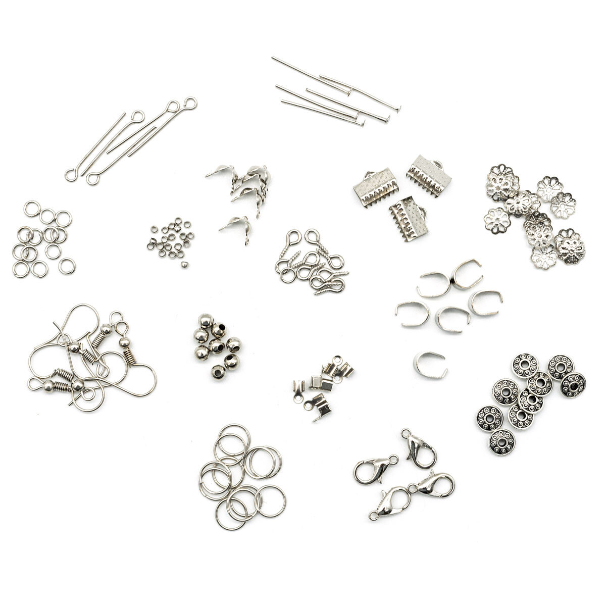 В этом наборе вы найдете необходимую фурнитуру для создания бижутерии, а также ремонта готовых украшений. Элементы из набора позволят вам решить разные задачи: – собрать бусины в один ряд или зафиксировать детали с помощью разъемных колец; – оформить удобную застежку для украшения, используя карабин; – уплотнить конец ленты, шнура с помощью зажима или концевика. – украсить бусины шапочками; – создать серьги, используя основы; – закрепить фурнитуру или украшения на изделии с помощью штифтов; – и многое другое. Фурнитура изготовлена из металлического сплава цвета никель, сохраняет цвет и не темнеет при длительном контакте с кожей. В наборе: – соединительные кольца (2 вида), 100 (+/–5) шт. и 270 (+/–5) шт.; – держатель для кулона – 20 шт.; – замок-карабин – 30 шт.; – концевики (2 вида) для шнура 100 шт., и ленты 20 шт.; – зажимные бусины (2 вида) 100 (+/–5) шт. и 200 (+/–5) шт.; – шапочки для бусин (2 вида), 30 шт. и 100 (+/–5) шт.; – основы для серег – 20 шт.; – зажим для узла – 50 шт.; – штифты: простой 100 (+/–5) шт., винтовой 70 (+/–5) шт., с петлей – 100 (+/–5) шт.