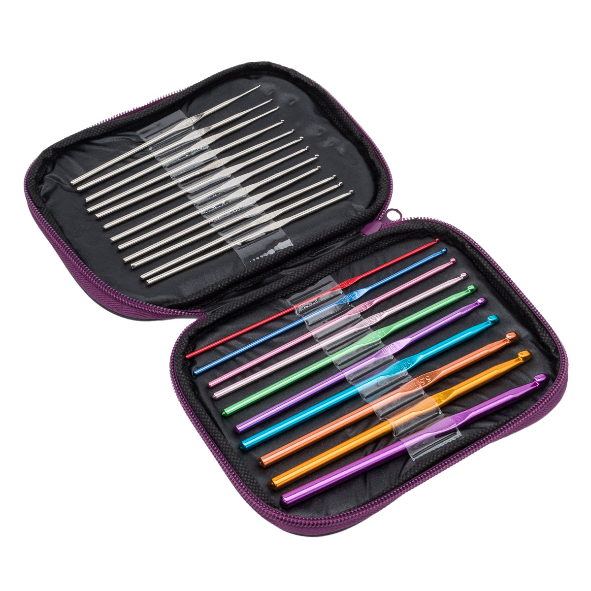 Набор крючков для вязания из алюминия содержит основные размеры, необходимые для реализации ваших творческих проектов. Этот комплект станет отличным подарком для рукодельниц и тех, кто увлекается вязанием. Крючки для вязания набор включает в себя самые популярные размеры, которые позволяют вязать любые вещи и аксессуары. Крючок для вязания идеально подходит для работы с пряжей разной толщины и фактуры. Крючки для вязания идеально подходят для создания шалей, платьев, топов, салфеток и модных игрушек амигуруми, а также других изделий. Набор упакован в мягкий чехол с отделениями, обеспечивающий аккуратное и безопасное хранение инструментов. Набор крючков в чехле - это всегда отличный подарок для вязальщицы. Крючки изготовлены из алюминия высокого качества со специальной обработкой, а также из стали. Благодаря специальному покрытию нить удобно скользит при работе, поверхность защищена от коррозии, а светлая пряжа от соприкосновения со спицами не меняет цвет, отличается высокой прочностью и упругостью, идеально защищен от коррозии. При этом светлая шерстяная пряжа от соприкосновения с ним не темнеет. Количество: 22 штуки. Размеры крючков из стали: 12 штук длиной 12,5 см, № 0,60 мм; 0,75 мм; 0,85 мм; 0,90 мм; 1,0 мм; 1,10 мм; 1,25 мм; 1,40 мм; 1,50 мм; 1,60 мм; 1,75 мм; 1,90 мм. Размеры крючков из алюминия: 10 штук длиной 15 см, № 2,0 мм; 2,5 мм; 3,0 мм; 3,5 мм; 4,0 мм; 4,5 мм; 5,0 мм; 5,5 мм; 6,0 мм; 6,5 мм.