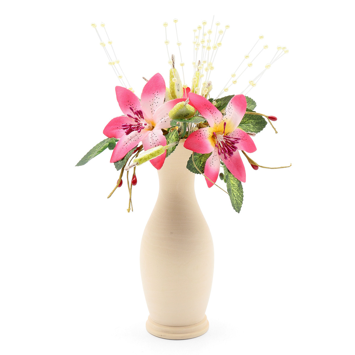 Набор мини-букетиков искусственных цветов – яркая и практичная основа для декорирования. Букетики изготовлены из искусственных материалов, они яркие, не требуют особого ухода и надолго сохранят внешний вид. При необходимости аккуратно протрите их влажной тканью или стряхните пыль. Несколько идей: – украсьте букетиком комнатный цветок в горшочке, это будет забавная и оригинальная деталь; – попробуйте себя в роли флориста: добавьте искусственную зелень, цветы и соберите авторскую композицию; – используйте для оформления фотосессий; – вместе с другим декором подходящих цветов оформите листьями витрину кофейни, магазина. В наборе: букетик 'Груши половинки зеленые' (высота 31 см), 12 шт.; цветы 'Веточка с бусинами' (3 мм, высота 21 см); букетик 'Лилия' (7х3 мм, высота 12 см). Цвет набора: ярко-розовый. Обратите внимание: вазочка на фотографии не входит в набор.