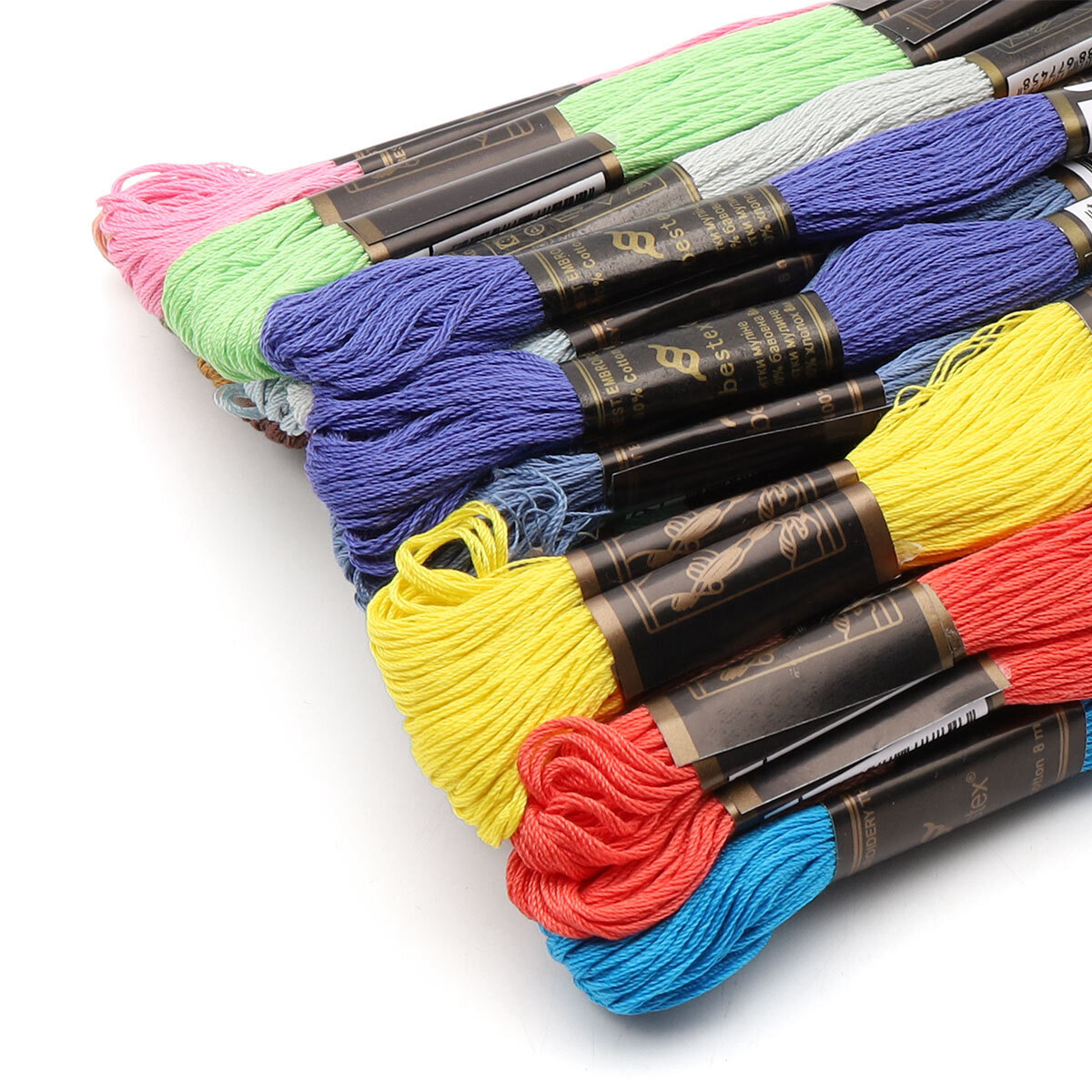 Большой набор мулине 'Вышивальная палитра' от Bestex подойдет как начинающим, так и опытным мастерицам. Нитки изготовлены из 100% мерсеризованного хлопка, имеют мягкий блеск. Тонкие, износостойкие, равномерные по всей длине. При вышивании образуются аккуратные стежки. Используйте эти мулине, чтобы, вышивать крестом, гладью и другими техниками. Подходят для сюжетов различной сложности, например: – художественных схем с частичной или полной зашивкой; – букв, цифр и надписей; – каймы или орнаментов. Каждая пасма состоит из 6 отдельных тонких нитей. Благодаря новейшим технологиям мулине Bestex яркие, легкие, равномерные по всей длине. Утолщения и узелки практически не встречаются. Четко выраженная структура нити позволяет использовать мулине для вышивания равномерного полотна. Вся продукция Bestex имеет экологический сертификат Oeko-Tex. Количество цветов: 25, по 2 пасмы для каждого цвета. В наборе 50 шт. по 8 м.