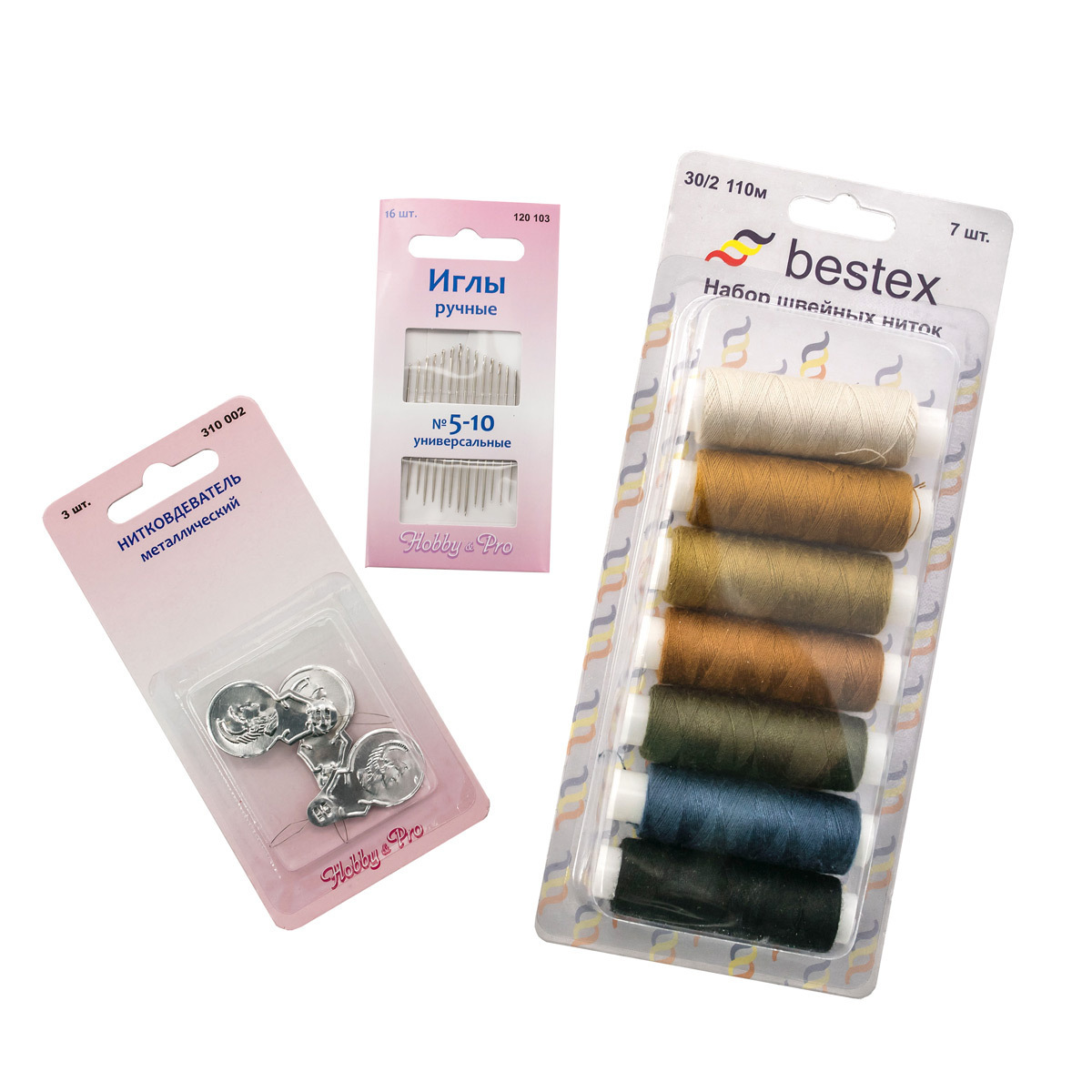 Этот небольшой набор подходит для шитья, а также мелкого ремонта одежды – если у вас оторвалась пуговица, распоролся шов или на материале образовалась небольшая прореха. В наборе вы найдете нитки повышенной прочности разных цветов – классических черного, белого, бежевого, темно-синего, коричневого, оранжевого. Нитки в наборе изготовлены из 100% полиэстера, они используются для шитья вручную или на швейной машине, подходят для форменной или специальной одежды. Прилагается также комплект ручных игл универсального назначения. Все иглы равномерные по толщине, поэтому они не повреждают ткань и подойдут даже для деликатного атласа или сатина. Нитевдеватель классической конструкции значительно упрощает вдевание нити. В упаковке: – Набор ниток 30/2, ассорти, 110 м, упак./7 шт., Bestex; – Иглы Hobby&Pro швейные универсальные №5-10, 16 шт.; – Нитковдеватель Hobby&Pro металлический, 3 шт.