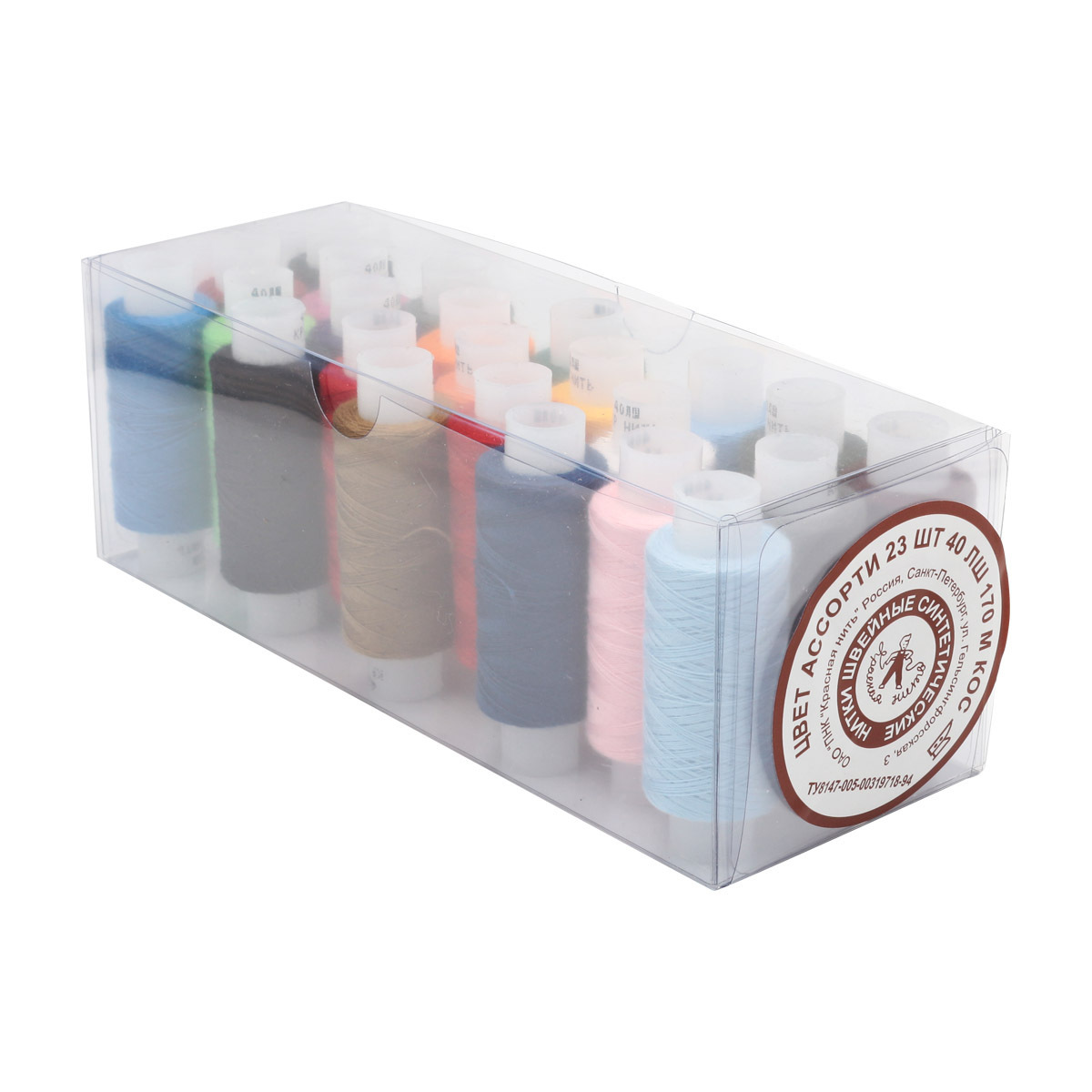 Набор ниток 40 ЛШ 170 м 'Ассорти' от известного бренда 'Красная нить' порадует любителей шитья разнообразием цветовой гаммы и прочностью. Набор представлен в удобной прозрачной упаковке, где находятся 23 катушки швейных ниток, изготовленных из 100% плотного штапельного полиэфирного волокна. Длина нити в одной катушке – 170 м. Произведены в России, что является показателем высокого качества. Нитки подходят для шитья вручную и на бытовых швейных машинах. Обладают высокой упругостью волокна, поэтому шов на изделии будет прочным, что обеспечит долговечность ваших любимых вещей. Нитки устойчивы к органическим растворителям, отбелке, микроорганизмам и плесени, а также к химической и мокрой стирке. Имеют хорошую стойкость окраски. Используйте нитки для шитья и ремонта изделий из костюмных и пальтовых тканей. Отлично подходят для спецодежды и трикотажа.