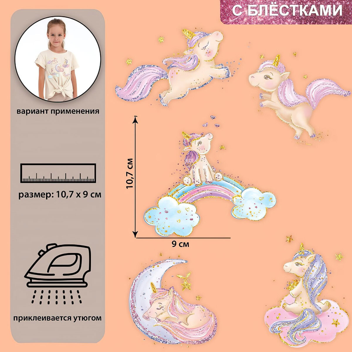 Набор термотрансферов Единорожки с блёстками 19х21см, 7339279, 5 шт