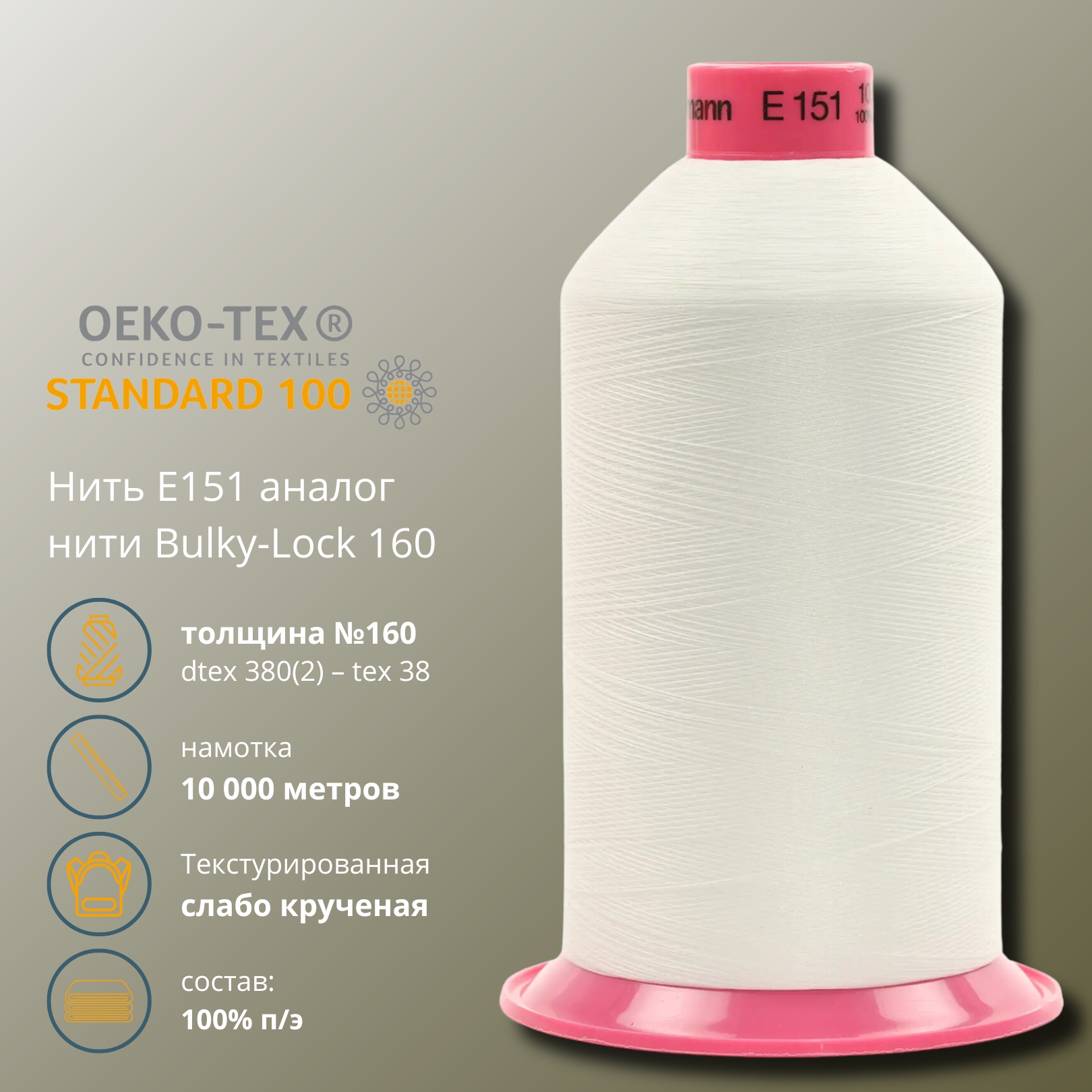 Gutermann E 151 – текстурированная швейная нить премиального качества, специально разработанная для особенно мягкой обработки кромок изделия, обметки швов, создания эластичных швов. Нитки хорошо сочетаются с материалами легкого и среднего веса, в том числе эластичными. Подходят для шитья одежды для спорта и отдыха, нижнего белья, купальных костюмов. Могут использоваться в качестве игольной нити, поэтому пригодны для универсального применения. – изготовлено в Германии; – материал: 100% текстурированный полиэстер; – длина нити: 10 000 м; – рекомендуемый размер иглы: №65–70; – толщина нити: №160 (dtex 190(1) – tex 19); – разрывная нагрузка: > 620 cN; – для оверлоков и плоскошовных машин; – эластичность и мягкость; – стойкий цвет.