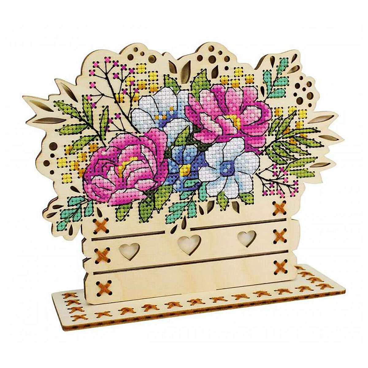 Новинка от бренда 'МП Студия' – набор для вышивания на деревянной основе 'Цветочная композиция'. Чтобы создать такой сувенир, не потребуются даже пяльцы, достаточно владеть техникой 'крест' и точно следовать инструкции. Когда вышивка будет готова, соберите детали подставки, и оригинальный сувенир готов! Основа из фанеры не требует обязательной обработки, но при желании отдельные детали можно предварительно покрыть лаком или расписать акриловыми красками. Внимание: дождитесь, пока покрытие полностью высохнет, чтобы не повредить роспись и не испортить нитки. В наборе: деревянная перфорированная заготовка, мулине ПНК им.Кирова, схема, фетр, игла, инструкция. Количество цветов: 18.