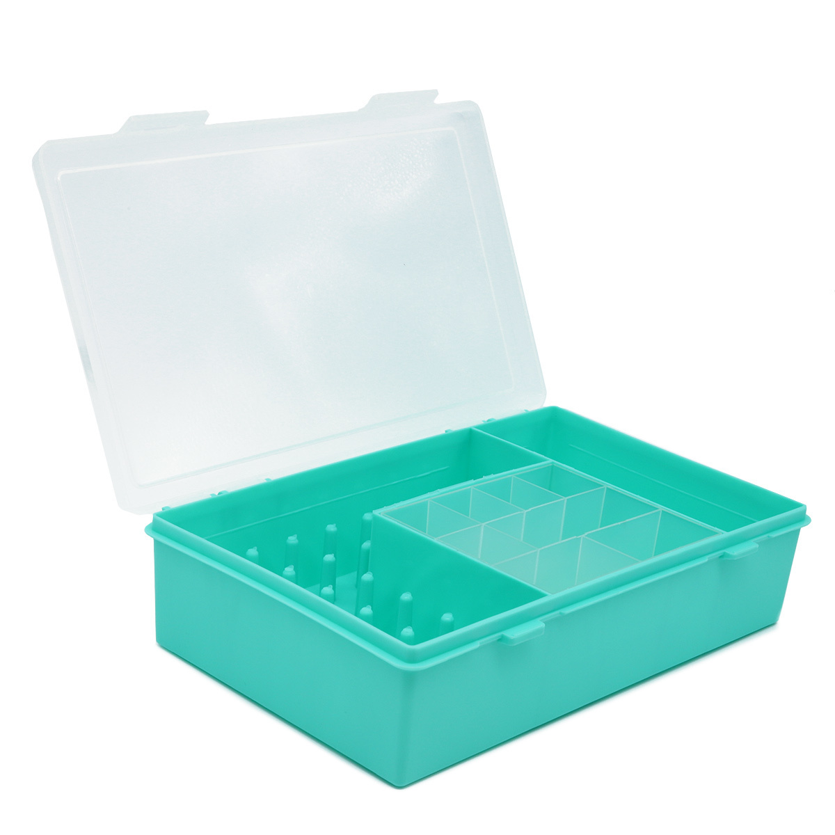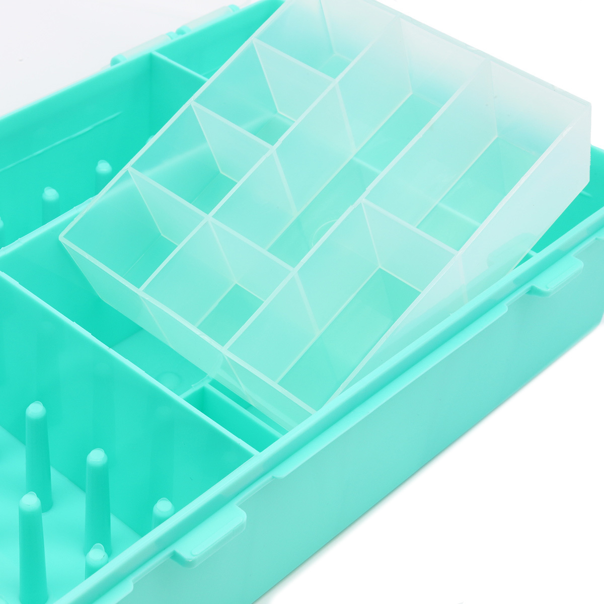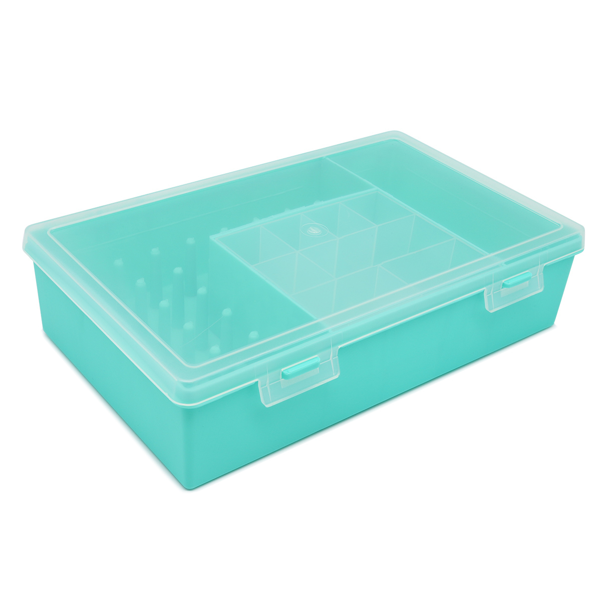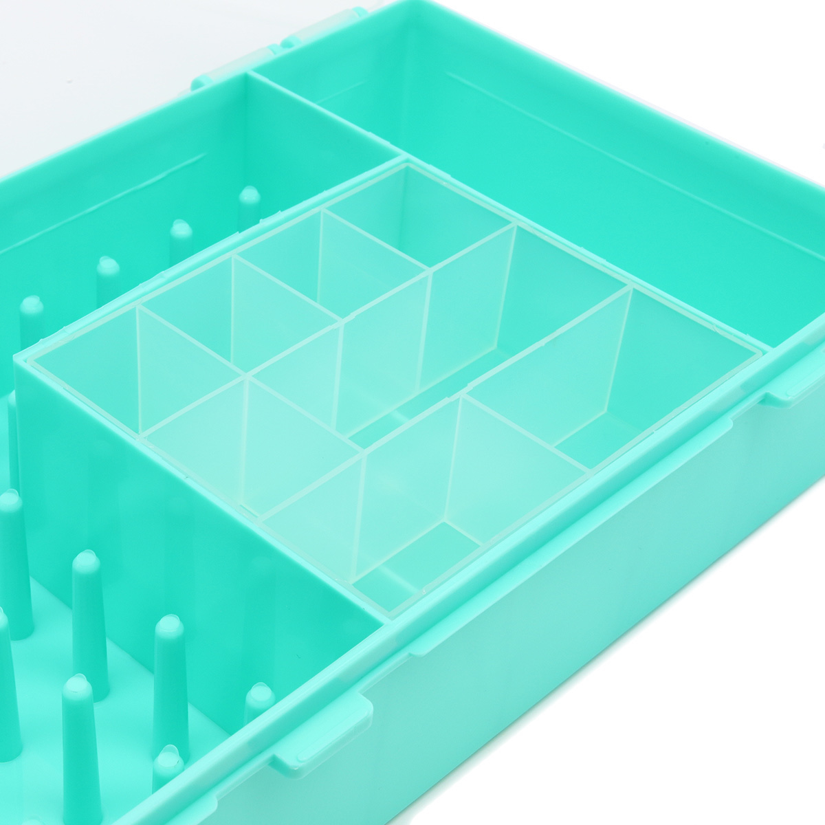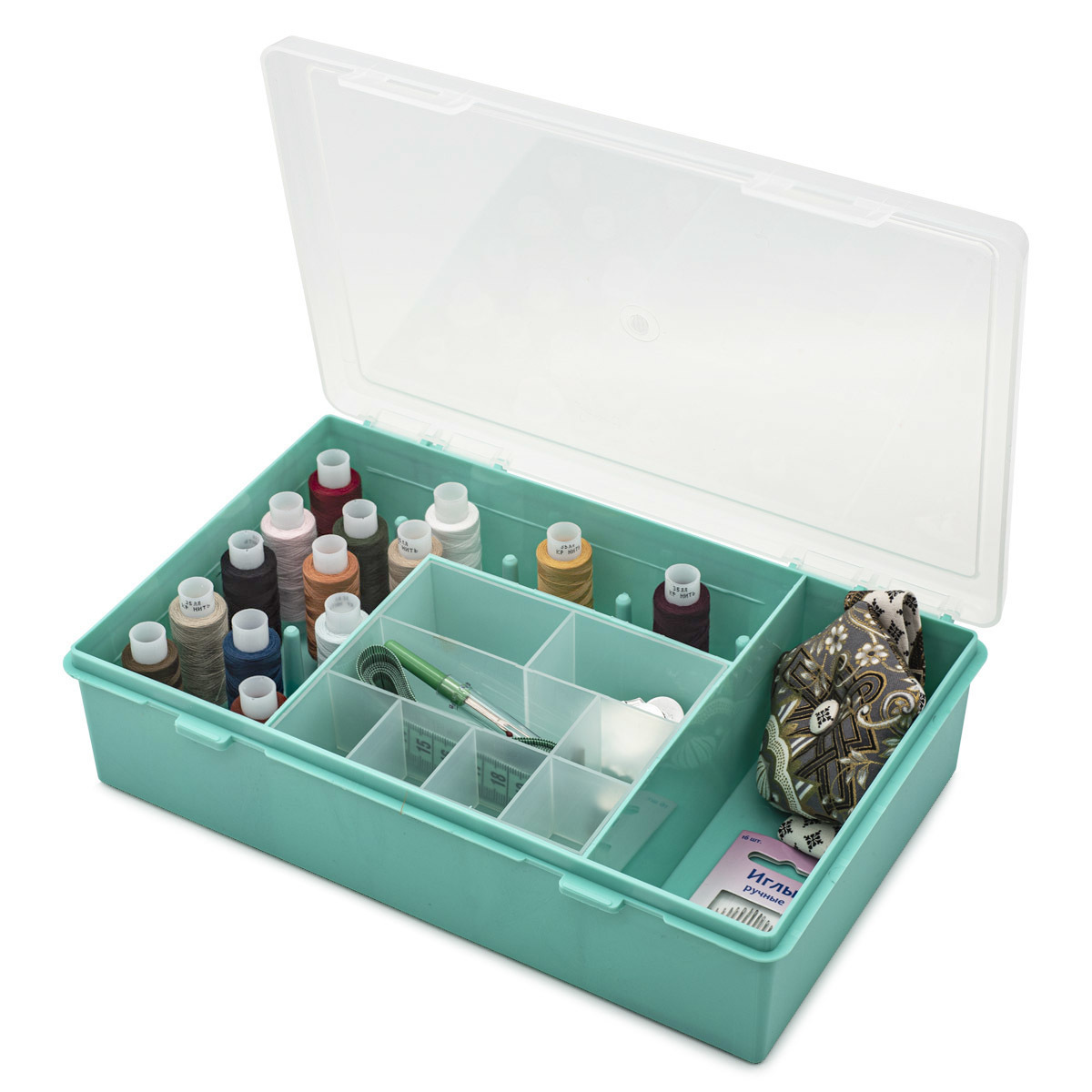 Вместительный пластиковый органайзер бирюзового цвета позволяет аккуратно разложить нитки, булавки, пуговицы и другие швейные принадлежности. Особенности: – Крышка из прозрачного пластика плотно закрывается на две клипсы, содержимое не выпадет при транспортировке. – Внутри 15 секций для швейных ниток на бобинах и 9 отделений для других принадлежностей. – Имеется отдельная секция для ножниц. Этот органайзер пригодится всем, кто занимается шитьем и машинной вышивкой: – Профессиональным швеям и швеям-любителям. – Учащимся на курсах кройки и шитья. – Детям для занятий на уроках труда. Подходит также для хранения домашнего швейного набора или рыболовных принадлежностей. Размер: 28х18,5х7 см.