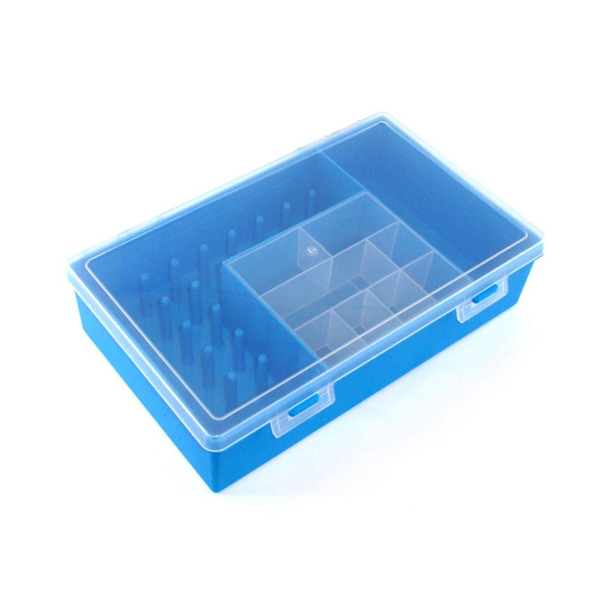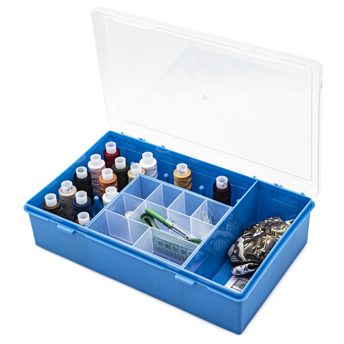 Вместительный пластиковый органайзер синего цвета позволяет аккуратно разложить нитки, булавки, пуговицы и другие швейные принадлежности. Крышка из прозрачного пластика плотно закрывается на две клипсы. Внутри 15 секций для швейных ниток на бобинах и 9 отделений (в том числе 1 отделение для ножниц). Контейнер можно использовать для хранения домашнего швейного набора, кроме того, он пригодится учащимся на курсах кройки и шитья или детям для занятий на уроках труда. Можно использовать для рыболовных принадлежностей. Размер: 28х18,5х7 см.