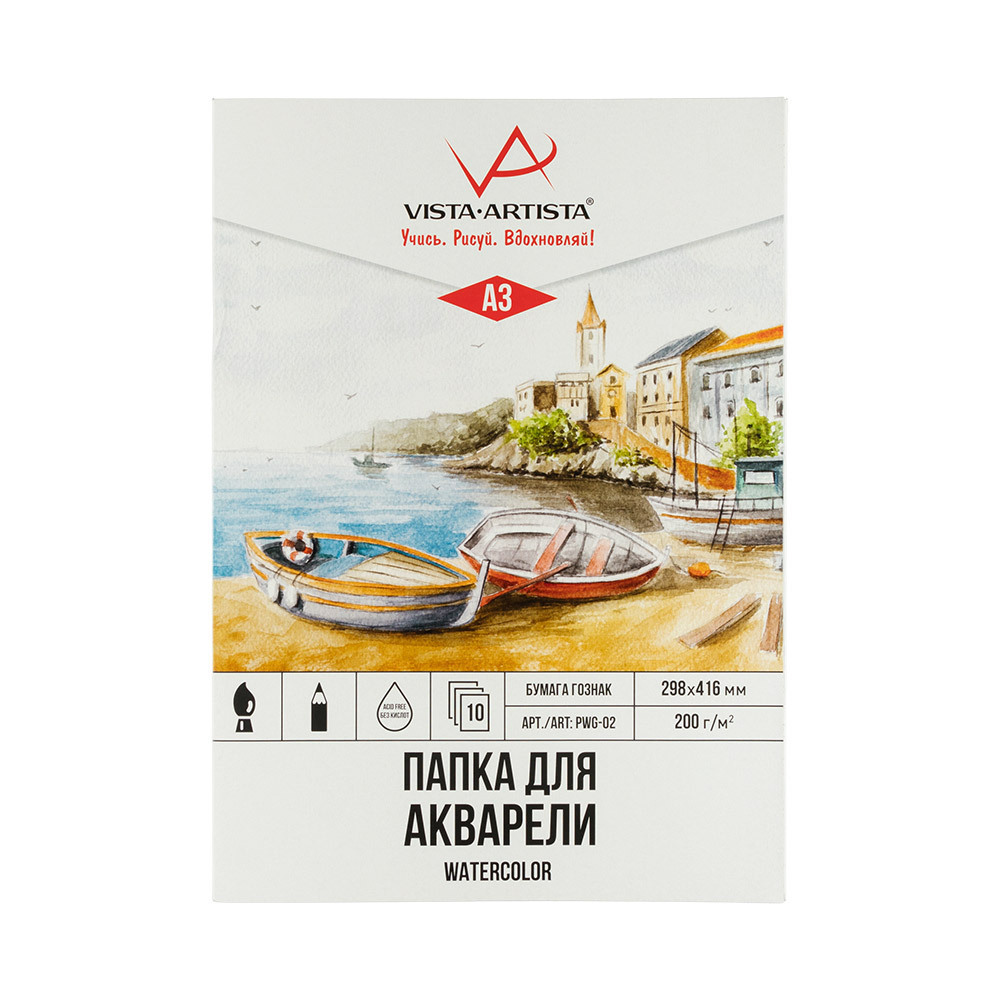 Папка с бумагой для акварели А3 200 г/м², папка 10 л, Гознак тисненая PWG-02, Vista-Artista
