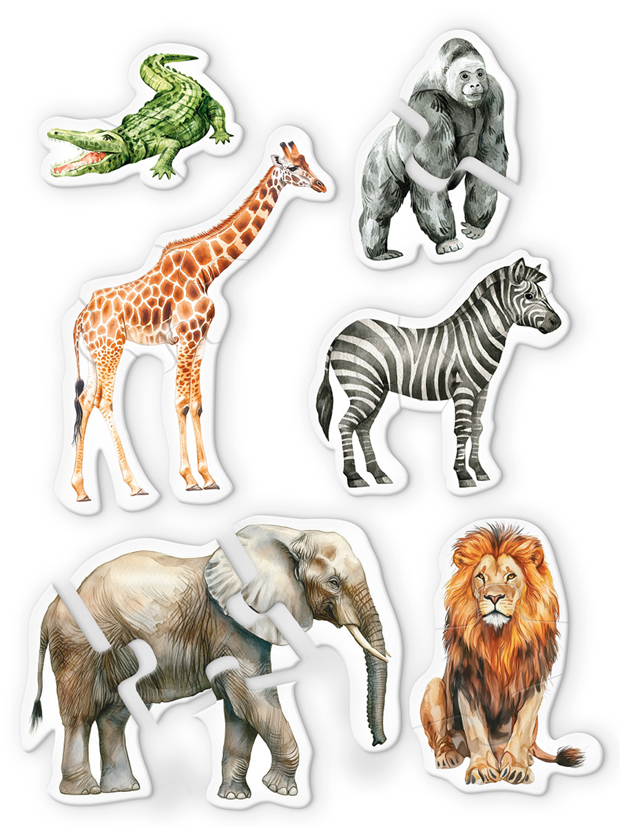 Набор содержит 6 фигурок, состоящих из 2–4 частей. Размеры собранных изображений: от 6 до 15 см.