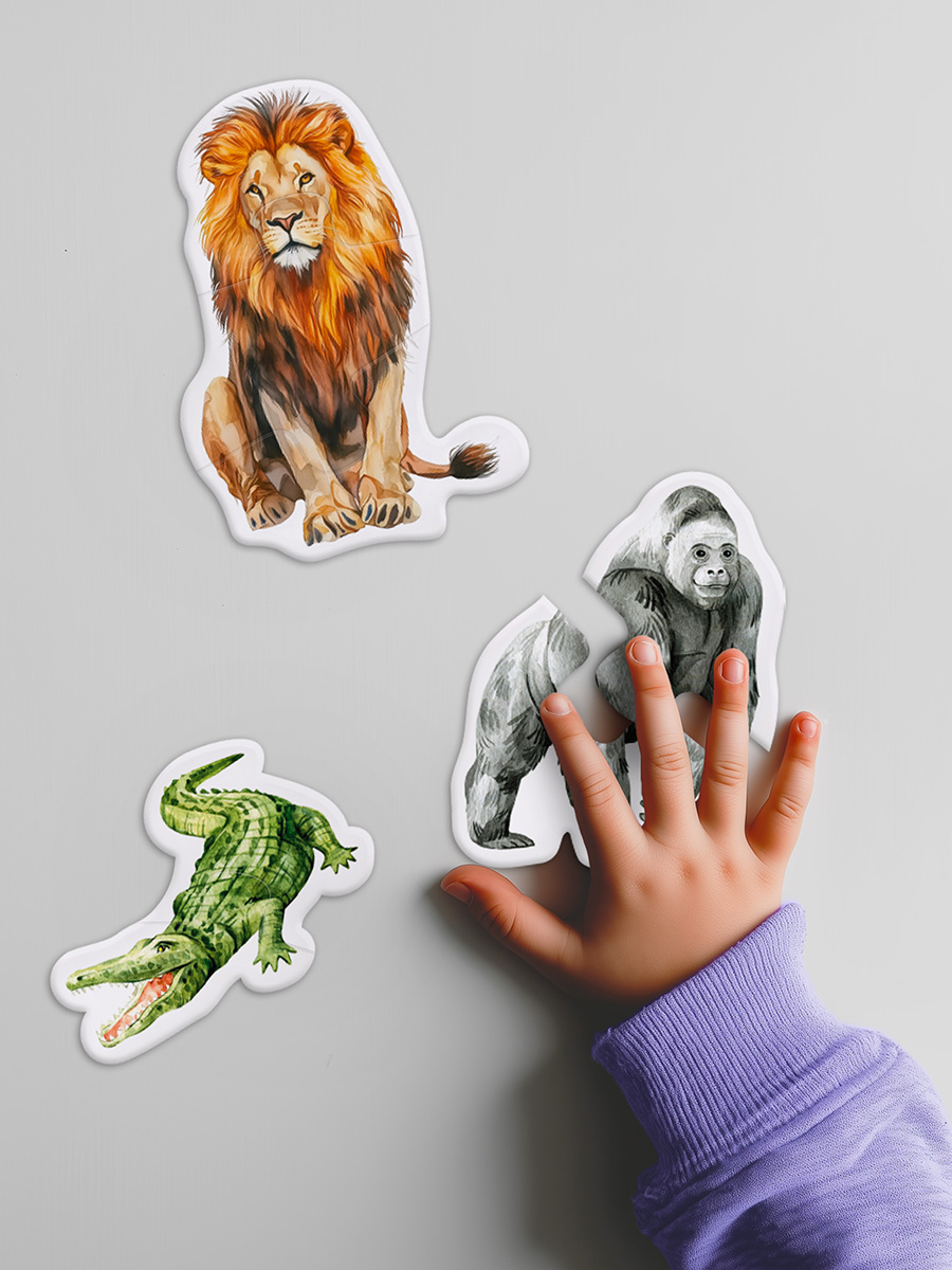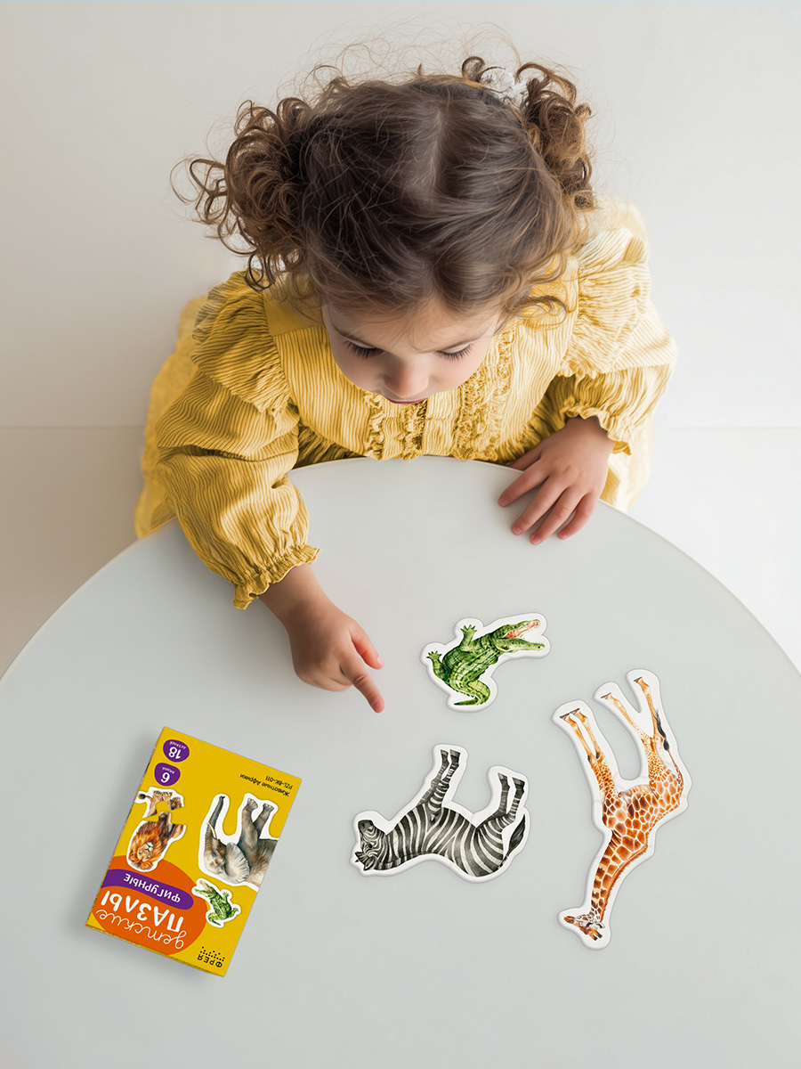 Фигурные пазлы, состоящие из нескольких элементов, учат ребенка собирать цельный образ из частей и развивают пространственное мышление.