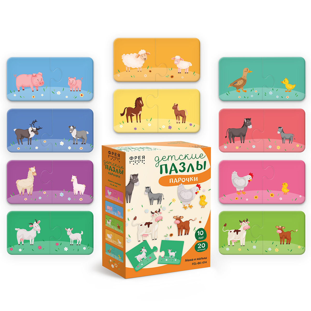 Набор содержит 10 пар пазлов, размером 13х6,5 см.