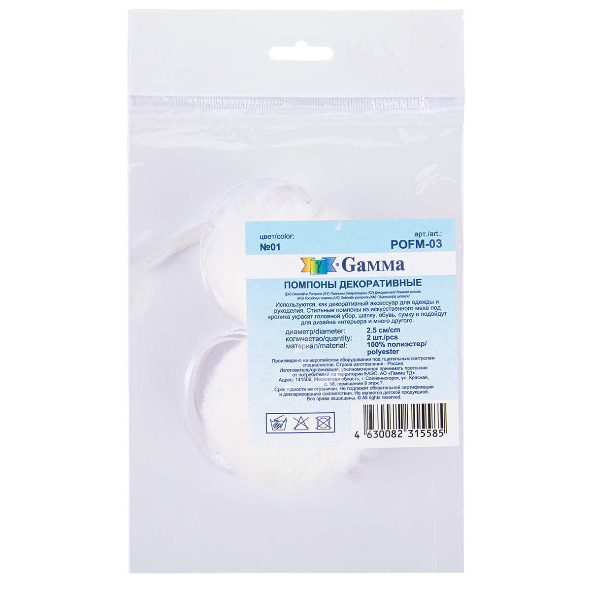 Помпоны декоративные кролик, 2 шт, 01 белый, Gamma POFM-03