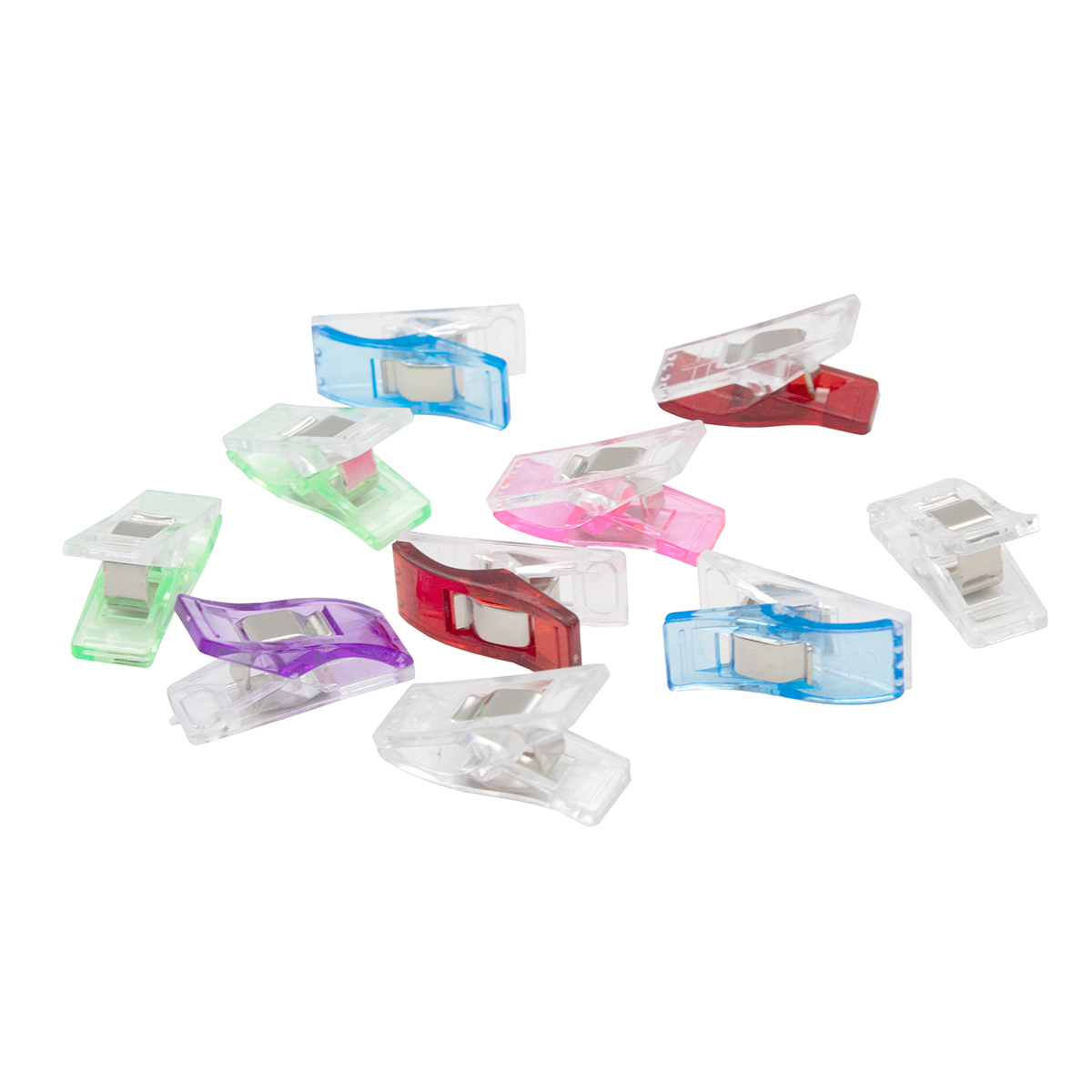 Прищепки для работы с тканями еще один удобный аксессуар для мастериц занимающихся различными видами рукоделия: раскрой и шитье одежды, пэчворк, квилтинг и другие. В упаковке шесть штук прищепок, выполненных из цветной пластмассы с использованием металлических элементов. С помощью прищепок удобно фиксировать фрагменты ткани при сшивании. Идеальная альтернатива булавкам. Особенно хорошо подходят для тканей, на которых долго остаются следы проколов иглой. Размер: 2,5 см. Количество: 10 штук в упаковке.