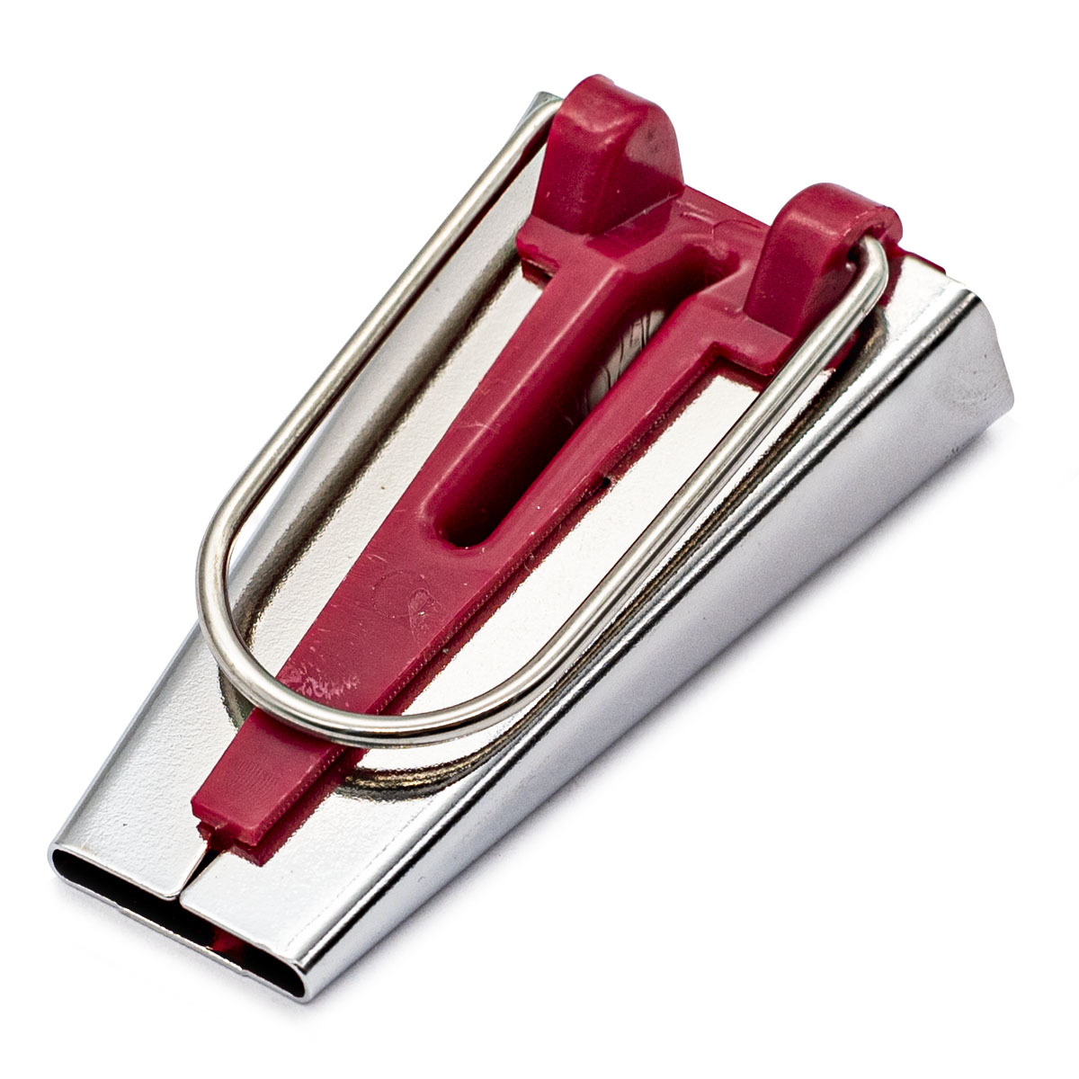 Нужна косая бейка, но подходящего цвета или типа нет в магазине? Это не проблема, если у вас есть специальное устройство. Вы создадите бейку быстро, аккуратно и без особых усилий. Инструкция: – отрежьте ровную полоску ткани строго под углом 45 градусов; – аккуратно проденьте получившуюся полоску в приспособление; – закрепите булавкой край материала с припусками; – аккуратно протягивайте полоску с другой стороны. Получившиеся припуски проглаживайте утюгом. Размер: ширина косой бейки 18 мм.