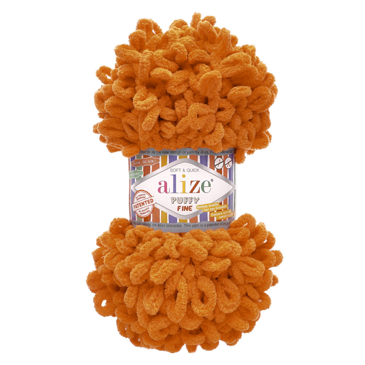Alize puffy fine - пряжа с петельками для вязания руками. Отличительной чертой пряжи Ализе Пуффи Файн являются маленькие петельки высотой 2 см. По сравнению с традиционной пряжей Alize puffy, размер петелек здесь уменьшен в два раза, что делает работу с материалом более комфортной. Главная особенность этой пряжи заключается в том, что она не требует использования классических инструментов для вязания- ни спиц, ни крючка. Вязание осуществляется руками- каждая петелька аккуратно продевается в следующую. Используйте эту пряжу для знакомства детей с искусством вязания. Процесс обучения превращается в увлекательную игру и дети с энтузиазмом включаются в творческий процесс. Основное преимущество пряжи – это невероятная мягкость и пушистость, достигаемые благодаря составу - 100% микрополиэстеру. Этот материал не только приятен на ощупь, но и обладает высокими эксплуатационными характеристиками. Изделия из Puffy Fine сохраняют форму и яркость цвета даже после многочисленных стирок, ворс не выпадает, пряжа не подвержена усадке и образованию катышков. При необходимости ворс можно аккуратно расчесать с помощью мягкой щётки. Из Puffy fine можно создавать самые разнообразные вещи. Милые и уютные вещи для малышей получаются невероятно привлекательными и вызывают искреннюю радость у маленьких модников. Практичные комплекты для всей семьи можно создавать в различных вариациях: теплые шапки, стильные шарфы, балаклавы для активного отдыха и воздушные пледы. Домашний текстиль из этой пряжи приобретает особое очарование. Оригинальные накидки на кресла и стулья защищают мебель и создают неповторимый интерьерный акцент. Свободные свитеры идеально подходят как для взрослых, так и для детей. Широкий выбор оттенков позволяет воплотить в жизнь любые творческие идеи.