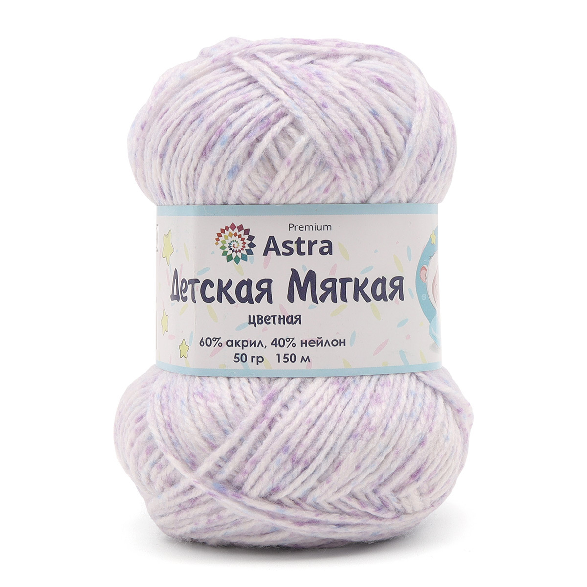 Пряжа Astra Premium 'Детская мягкая цветная' имеет приятную на ощупь и деликатную фактуру благодаря слабо выраженной крутке и особенностям материалов. Акрил и нейлон отличаются мягкостью, не вызывают аллергии и безопасны для нежной детской кожи. Нить с небольшим пушком, стабильная и пластичная. Вязаное полотно получается в меру тонким и немного рельефным. Готовые вещи выглядят нарядно благодаря оригинальному крашению с цветными вкраплениями. Пряжа 'Детская' Astra Premium прекрасно подходит для создания комбинезонов, шапочек, пинеток и даже мягких игрушек амигуруми. Рекомендуемые спицы / крючок №3-4. Состав: 60% акрила, 40% нейлона. Размер: 50 г / 150 м. Толщина нити: средняя. Рекомендации по уходу: ручная или деликатная машинная стирка при температуре до 40 градусов. Не использовать отбеливатели и средства с хлором. Профессиональная чистка с любым растворителем. Можно выжимать и сушить в стиральной машине. Гладить запрещено.