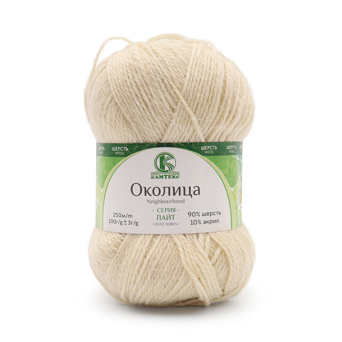 Околица' – это настоящая слабо обработанная овечья шерсть, достаточно тонкая, слабой крутки с выраженным ворсом. Нить классической крутки, состоит из трех нитей, имеет выраженный пушок. Представлена в натуральных цветах и оттенках, мягкая, но слегка колючая. Рекомендуется для вязания согревающих поясов, жилеток, носков. Подходит в первую очередь для носков. Благодаря шерсти ноги потеют меньше. Благодаря акрилу шерсть укреплена, носки дольше сохраняют первоначальный вид. Для прочности и устойчивости к износу в нить добавлен акрил. При правильном уходе вязаное полотно не дает усадки, после стирки изделие становится немного мягче. Изделия стирать вручную при 30 градусах. Состав: 90% шерсть, 10% акрил. Толщина нити: средняя. Рекомендуемые спицы/крючок: №4-6.