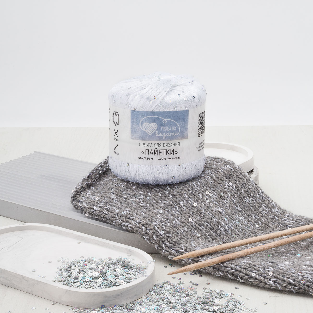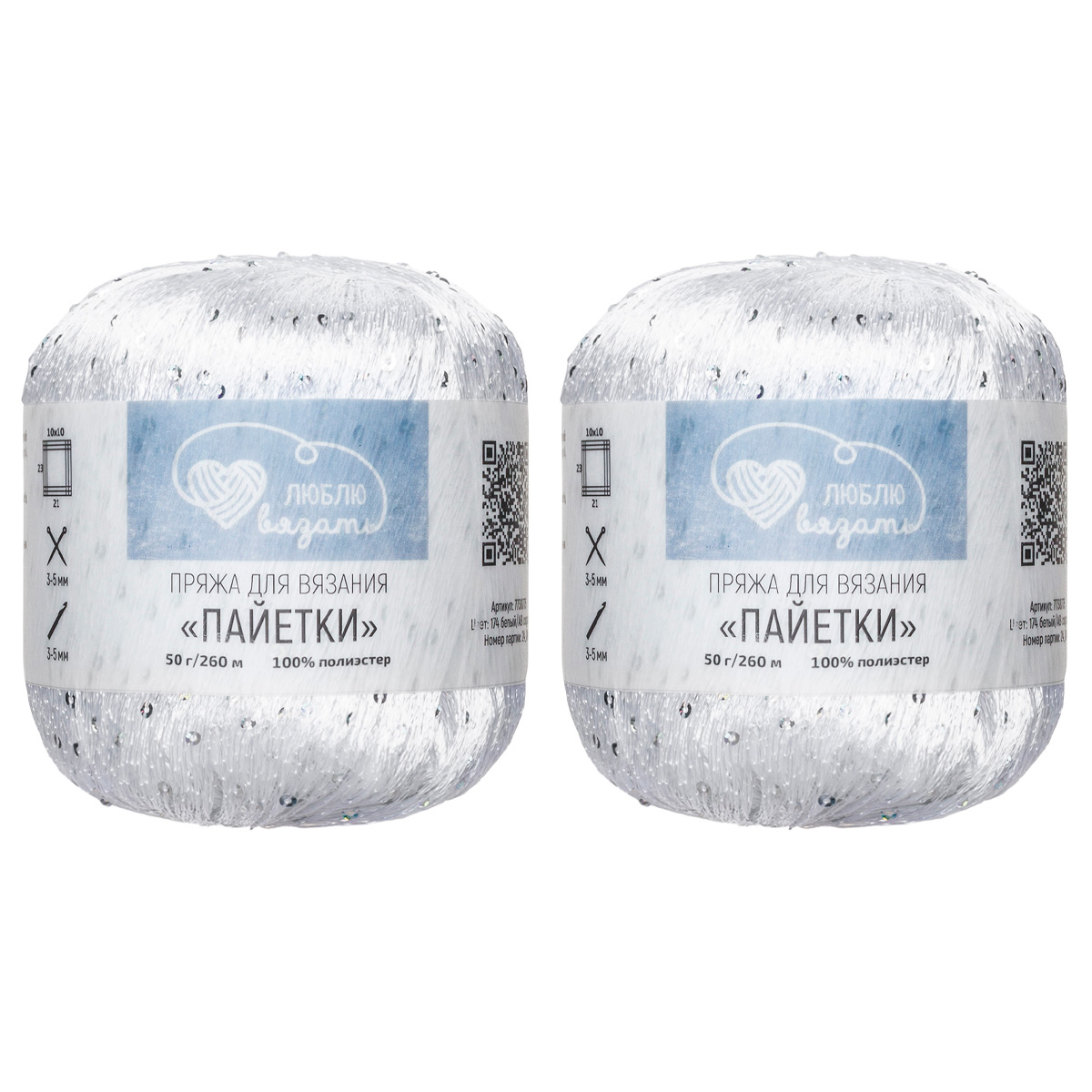 Пряжа Люблю вязать Пайетки / уп.2 мот. по 50 г, 260 м, 174 белый/AB серебро