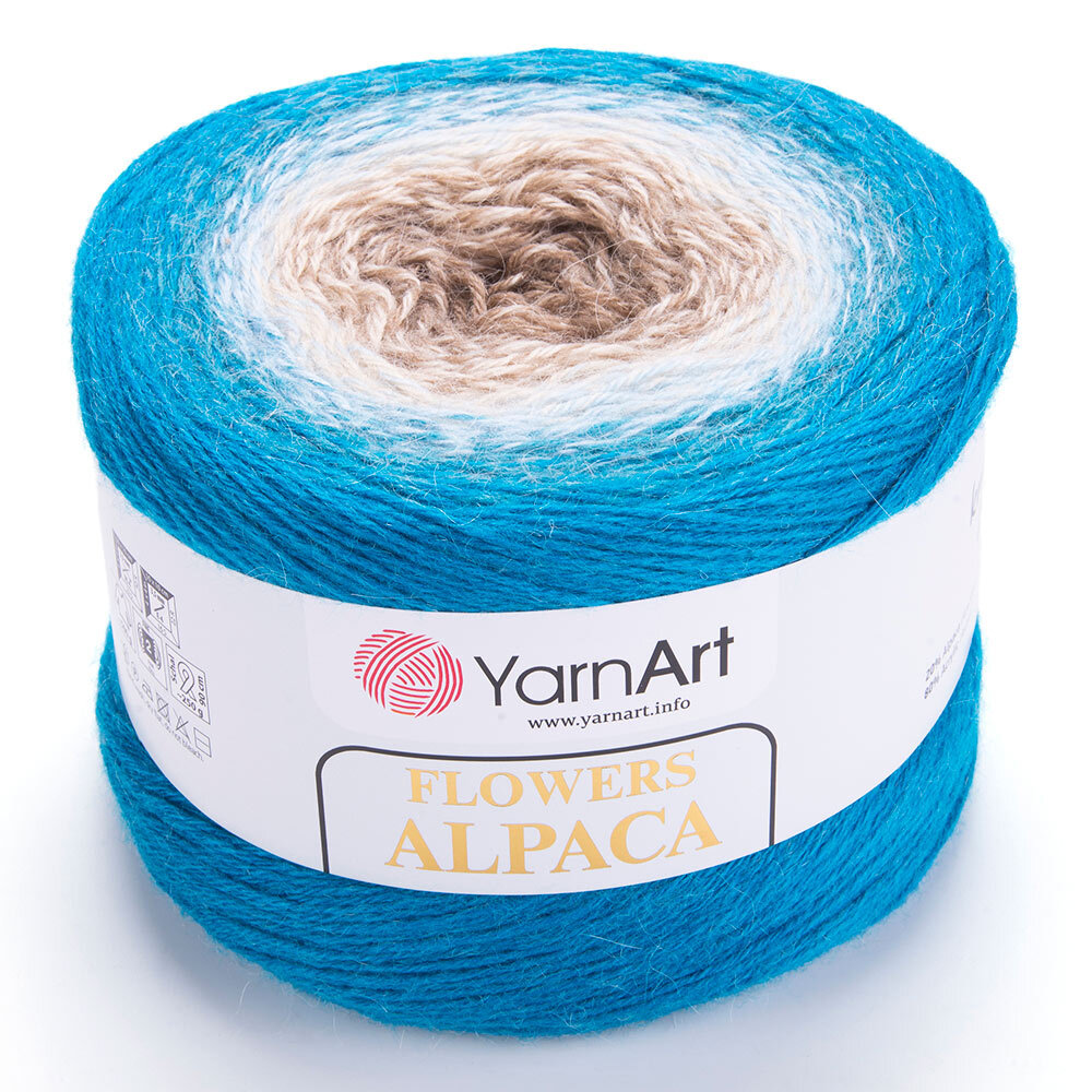 Flowers Alpaca от YarnArt – полушерстяная пряжа, окрашенная по секционной технологии. Длинные секции создают аккуратный контрастный узор. Ввязывать новую нить при этом не нужно – достаточно владеть простой техникой 'лицевая гладь'. Благодаря добавлению шерсти альпаки изделия из этой пряжи особенно мягкие, отлично согревают, не создают 'парниковый эффект', устойчивы к загрязнениям, не раздражают кожу. Классический акрил придает дополнительную мягкость, позволяет сохранять форму изделий после ношения и стирок. Flowers Alpaca – тонкая нить классической крутки, продается в мотках по 940 м. Одного мотка хватит, чтобы связать шаль или ажурный жилет. Используйте Flowers Alpaca для вязания трикотажа на прохладный сезон – свитеров и комплектов 'шапочка-шарфик', накидок. Состав: 20% шерсть альпаки, 80% акрил. Инструменты: спицы/крючок №3-3,5.
