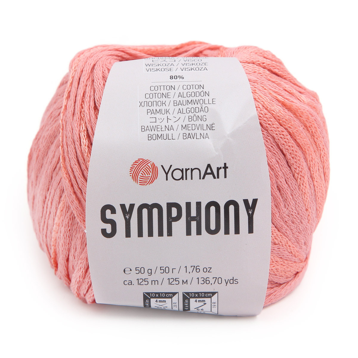 Symphony – необычная фантазийная пряжа от YarnArt. Она позволяет получить удивительный результат без особых усилий. Достаточно выбрать лицевую гладь или платочную вязку, чтобы получить полотно с ажурными просветами. Нить в виде шнура достаточно прочная, поэтому при правильном уходе вещи не будут вытягиваться. Пряжа Symphony изготовлена вискозы и хлопка – эти натуральные волокна комфортны даже для чувствительной кожи и как нельзя лучше подходят для летнего сезона. Хлопок обеспечивает гигроскопичность – не перегревает, пропускает влагу и обеспечивает нормальный воздухообмен. Вискоза придает гладкость, небольшой блеск и создает приятное ощущение прохлады. Ассортимент цветов пряжи тщательно продуман, он включает нежную однотонную пряжу, а также пестрые секционные расцветки для тех, кто любит контрастные сочетания. Рекомендуемые спицы / крючок №4. Состав: 80% хлопка, 20% вискозы. Толщина нити: тонкая. Размер мотка: 50 г / 125 м. Примечание Оттенки пряжи могут незначительно отличаться от представленных на фотографиях. Это зависит от партии товара, настроек экрана и освещения.