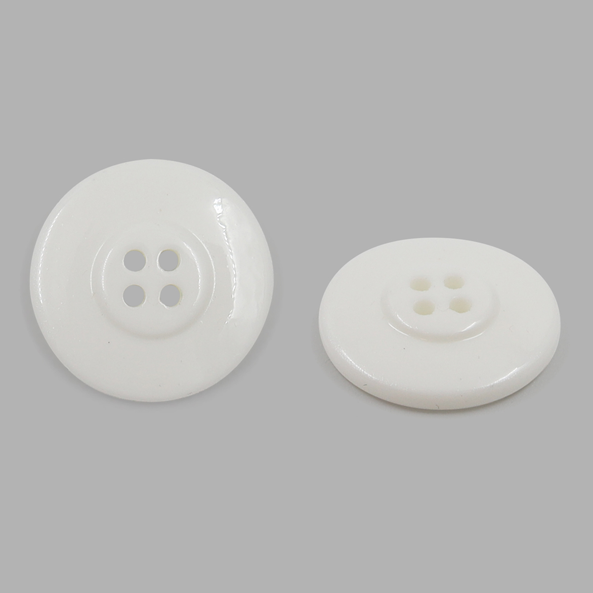 Пуговица костюмная с четырьмя проколами и с небольшим ободком имеет фактурную поверхность и лаконичный дизайн. Используются такие застежки при производстве верхней одежды, костюмов, пиджаков, брюк. Выпускают сразу несколько размеров костюмных пуговиц одного фасона, что дает возможность использовать их для бортов, карманов, шлиц в одном изделии. Изготовлена пуговица из пластика, отвечающего современным требованиям стандарта качества, покрытие застёжки долговечное, износостойкое, не содержит вредных веществ. В наше время рукодельницы используют декоративные пуговицы не только по назначению, а и в таких техниках как скрапбукинг, декорирование деревянных заготовок, изготовление картин, украшений, различных поделок.