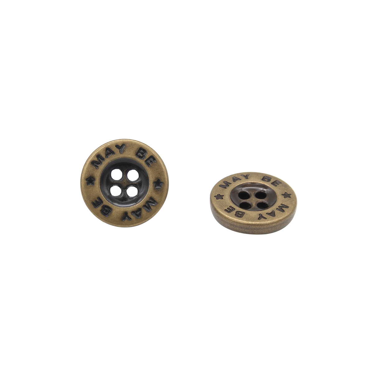 Металлическая сорочечная пуговица круглой шайбовидной формы с углублением по центру и надписью may be (в переводе: может быть) и изображением маленькой звездочки. Отличный вариант для дополнения изделия, выполненного в стиле сафари. Простые и натуральные ткани (хлопок, лён, натуральная кожа), лаконичный крой, преобладающие цвета хаки и оттенки песочного. Вы можете оформить данной моделью платья-рубашки, туники, брюки, шорты, рубашки, ветровки и жилеты, а также декорировать накладные карманы, пуговицы и ремни. Обратите внимание на размерный ряд. Пуговица выполнена из металла, на прокол с четырьмя отверстиями для пришивания. Размер: диаметр 16 мм. Цвет: латунь.