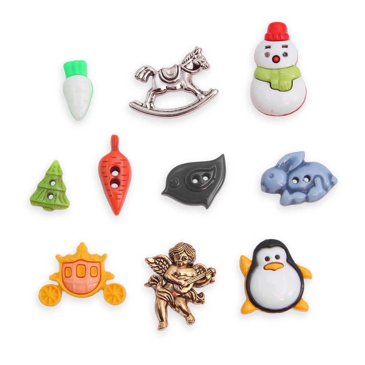 Набор пуговиц 'Ассорти' создан для любителей мастерить оригинальные поделки из подручных материалов. Россыпь пуговиц разных дизайнов и форм – основа для ваших творческих проектов. Несколько идей: – оформите пуговицами застежку на детской одежде; – украсьте детские вещи и аксессуары (сумки, головные уборы); – декорируйте авторскую открытку, обложку, блокнот в технике скрапбукинга; – используйте пуговицы с рисунком как часть композиции для декоративного панно; – расшейте пуговицами прихватку или рукавицу. В наборе пуговицы пластиковые, 34 штуки: 1. По 4 штуки на 2 прокола: 'Зайка' (23 мм); 'Морковка' и 'Птичка' (22 мм); 'Елочка' (16 мм). 2. По 3 штуки на ножке: 'Морковка' (18 мм); 'Пингвин' и 'Карета' (25 мм); 'Лошадка' и 'Снеговик' (28 мм), 'Ангел' (26 мм).