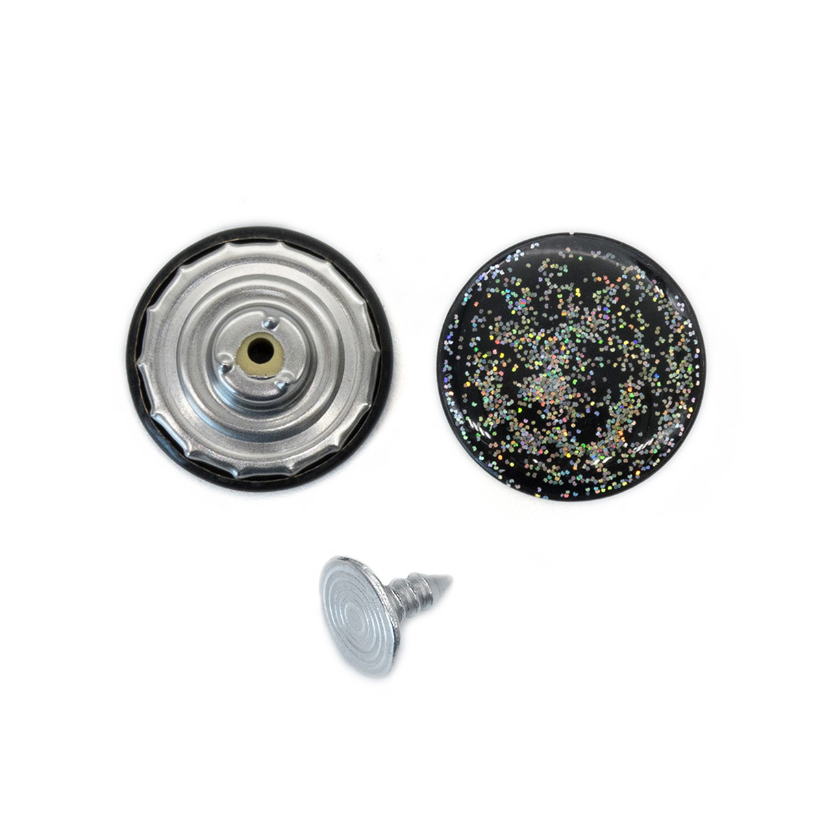 Джинсовые пуговицы состоят из двух частей: шляпки с нанесенным на нее фактурным рисунком и гвоздя с круговой надсечкой. Такие пуговицы подходят изделий из джинсовой ткани, парусины и других материалов саржевого переплетения. Используется при пошиве одежды, а также сумок, чехлов, рюкзаков. Чтобы установить этот элемент, потребуется ручной пресс, киянка или молоток. Пуговица выполнена из металла высокого качества, выдерживает стирку, химическую чистку, другие стандартные нагрузки. Размер: диаметр 18 мм. Цвет: черный с блестками.