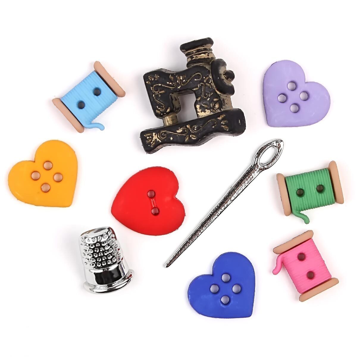 швейная машинка 25x26 мм (ножка) - 1 шт; наперсток 16x14 мм (ножка) - 1 шт; ножницы 16x13 мм (2 прокола) - 2 шт; катушка 15x13 мм (2 прокола) - 2 шт; сердце 16x18 мм (4 прокола) - 4 шт; игла 43x0,6 мм (1 прокол) - 1 шт