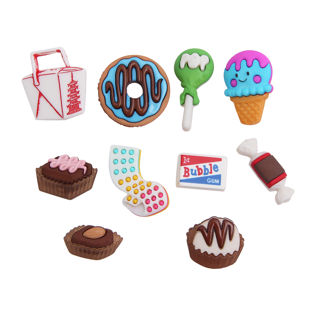 Декоративные пуговицы-фигурки Dress It Up – это огромное разнообразие тематик и форм, а также качественные материалы. Продукция разработана в США. Используйте пуговицы Dress It Up для любых ваших творческих проектов: – украсьте детские вещи и аксессуары (сумки, головные уборы); – оформите авторскую открытку, обложку, блокнот в технике скрапбукинга; – используйте как часть композиции для декоративного панно; – декорируйте прихватку, чехол на чайник; – создайте браслет, ожерелье, брошь и другое украшение. Изготовлены из пластика. Крепление на ножке + 1 шт. плоская, без крепления. В упаковке 9 шт.: пончик d-23 мм (плоская), 1 шт.; конфета 24x7 мм, 1 шт.; мороженое 24x16 мм, 1 шт.; леденец на палочке 28x13 мм, 1 шт.; пирожное 20x14 мм, 1 шт.; кекс 19x11 мм, 1 шт.; сумка 23x21 мм, 1 шт.; жевательная резинка 27x13 мм, 1 шт.; десерт 18x18 мм, 1 шт. Обратите внимание: производитель оставляет за собой право вносить изменения в дизайн, количество и комплектацию изделия без предварительного уведомления.