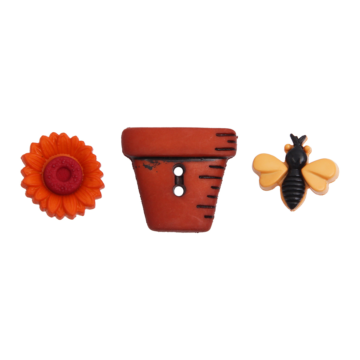 Пуговицы-фигурки Dress It Up – это яркие дизайны, огромное разнообразие тематик и форм, а также качественные материалы. Продукция разработана в США. Используйте украшения Dress It Up для любых ваших творческих проектов: – украсьте детские вещи и аксессуары (сумки, головные уборы); – оформите авторскую открытку, обложку, блокнот в технике скрапбукинга; – используйте как часть композиции для декоративного панно; – декорируйте прихватку, чехол на чайник; – создайте браслет, ожерелье, брошь и другое украшение. Изготовлены из пластика. Крепление на ножке и на 2 прокола. В упаковке 10 штук: пуговицы на ножке 'оса' (3 шт., 15х16 мм), 'подсолнух' (5 шт., 17х16 мм), пуговицы на 2 прокола 'цветочный горшок' (2 шт., 21х23 мм). Обратите внимание: производитель оставляет за собой право вносить изменения в дизайн, количество и комплектацию изделия без предварительного уведомления.