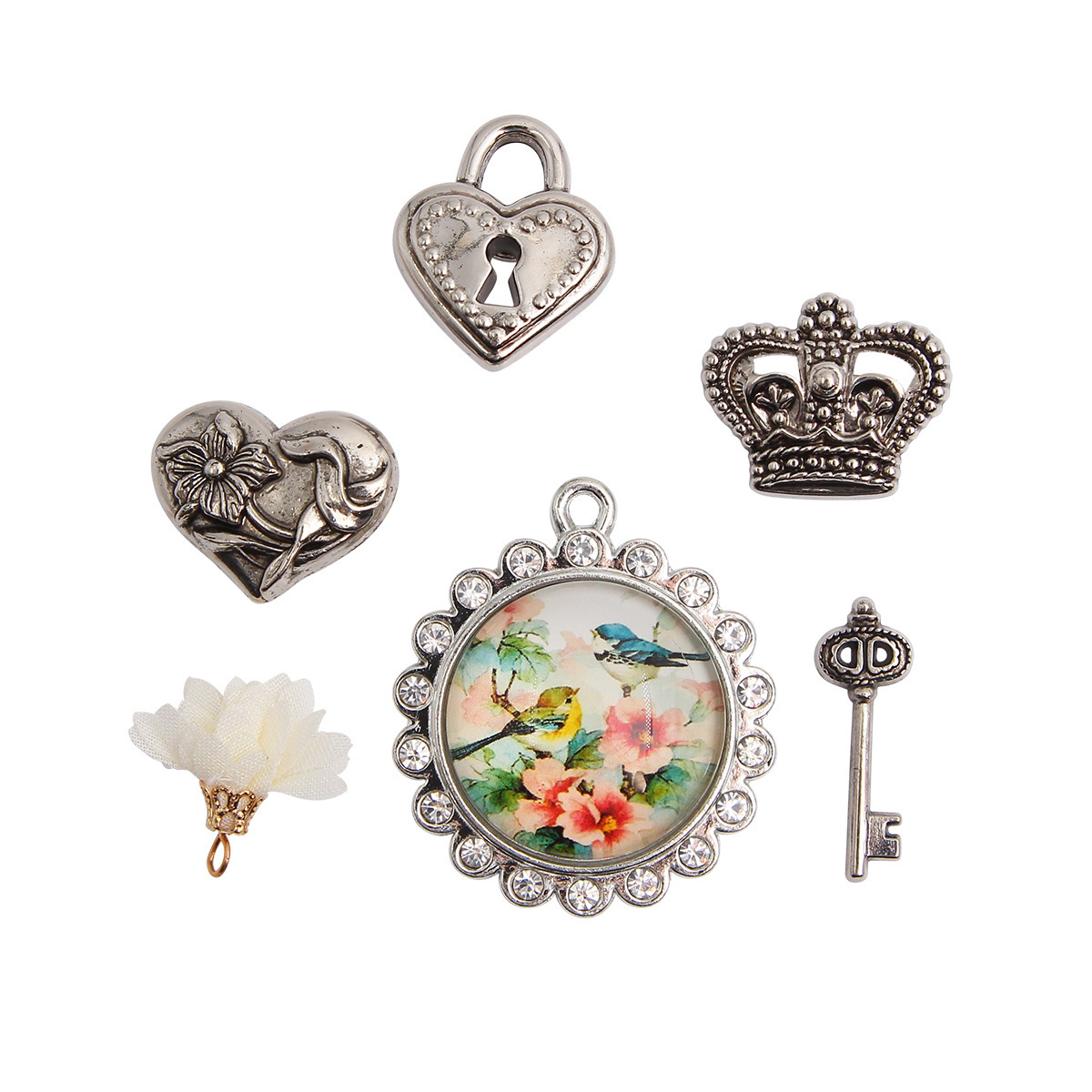 Декоративные пуговицы-фигурки Dress It Up – это огромное разнообразие тематик и форм, а также качественные материалы. Продукция разработана в США. Используйте пуговицы Dress It Up для любых ваших творческих проектов: – украсьте детские вещи и аксессуары (сумки, головные уборы); – оформите авторскую открытку, обложку, блокнот в технике скрапбукинга; – используйте как часть композиции для декоративного панно; – декорируйте прихватку, чехол на чайник; – создайте браслет, ожерелье, брошь и другое украшение. Изготовлены из пластика. Крепление на ножке + 3 подвески и 1 элемент без креплений. В упаковке: подвеска круглая большая 40x35 мм, 1 шт.; сердце 18x22 мм (ножка), 1 шт.; корона 19x22 мм (ножка), 1 шт.; замок сердце 24x20 мм (ножка), 1 шт.; ключик 26x0,9 мм (плоский), 1 шт.; цветочки белые подвески 17x13 мм, 2 шт. Обратите внимание: производитель оставляет за собой право вносить изменения в дизайн, количество и комплектацию изделия без предварительного уведомления.