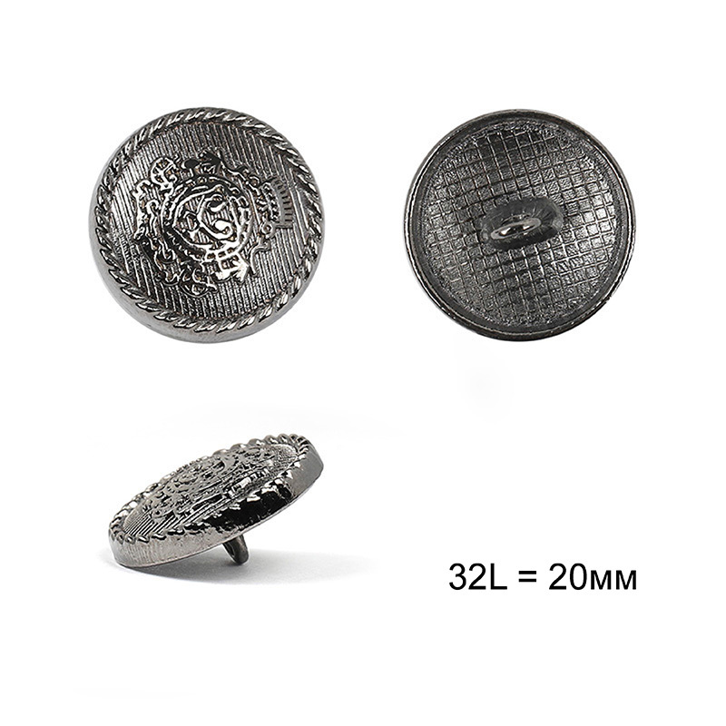 Пуговица с петелькой из высококачественного сплава металлов, лёгкая. Лицевая сторона пуговицы выпулкая с рельефным изображением. Этот вид пуговицы прекрасный акцент для костюмов, который придает одежде индивидуальность, а в некоторых случаях может объеденить группу людей в 'клуб', пришив на одежду одинаковые пуговицы.