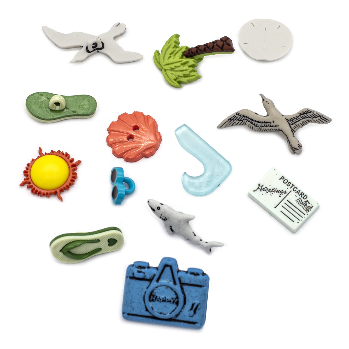 Декоративные пуговицы-пляж, могут являться прекрасным украшением на одежде как взрослого, так и ребенка. Очень часто декоративные пуговицы используют в праздничных или тематических костюмах, чтобы подчеркнуть идею образа. Пуговица в целом имеет большую область применения в одежде, обуви, сумках, шапках, аксессуарах и других принадлежностях гардероба. Исторически сложилось так, что роль пуговицы в одежде имеет свой смысл и носит определенный знак. Для рукодельницы пуговица это целый кладезь идей и возможности сделать изделие интересным и образ неповторимый. Форма пуговицы: фигурная. Количество: упаковка: 13 штук. Материал: пластик. Производитель: США.