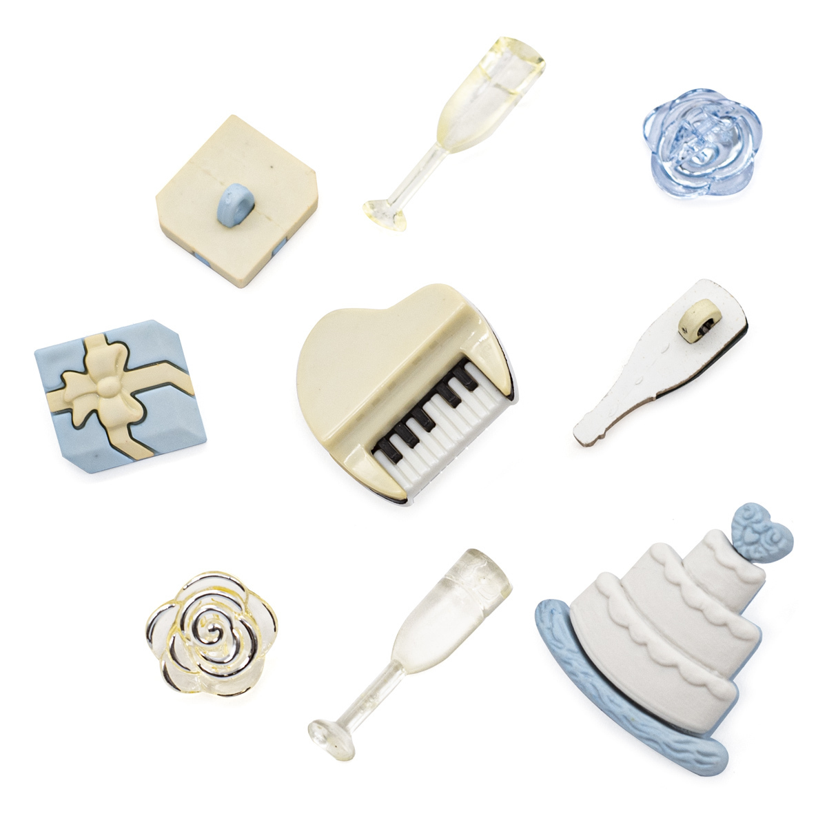 торт 29x29 мм (ножка) - 1 шт; рояль 25x24 мм (ножка) - 1 шт; фужеры 30x7 мм (плоские) - 2 шт; шампанское 25x8 мм (ножка) - 1 шт; розы d-15 мм (полуножка) - 2 шт; подарки 17x16 мм (ножка) - 2 шт