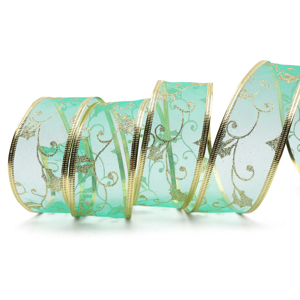 Лента упаковочная (органза) зеленый/золото 5см, 10м, QR-012