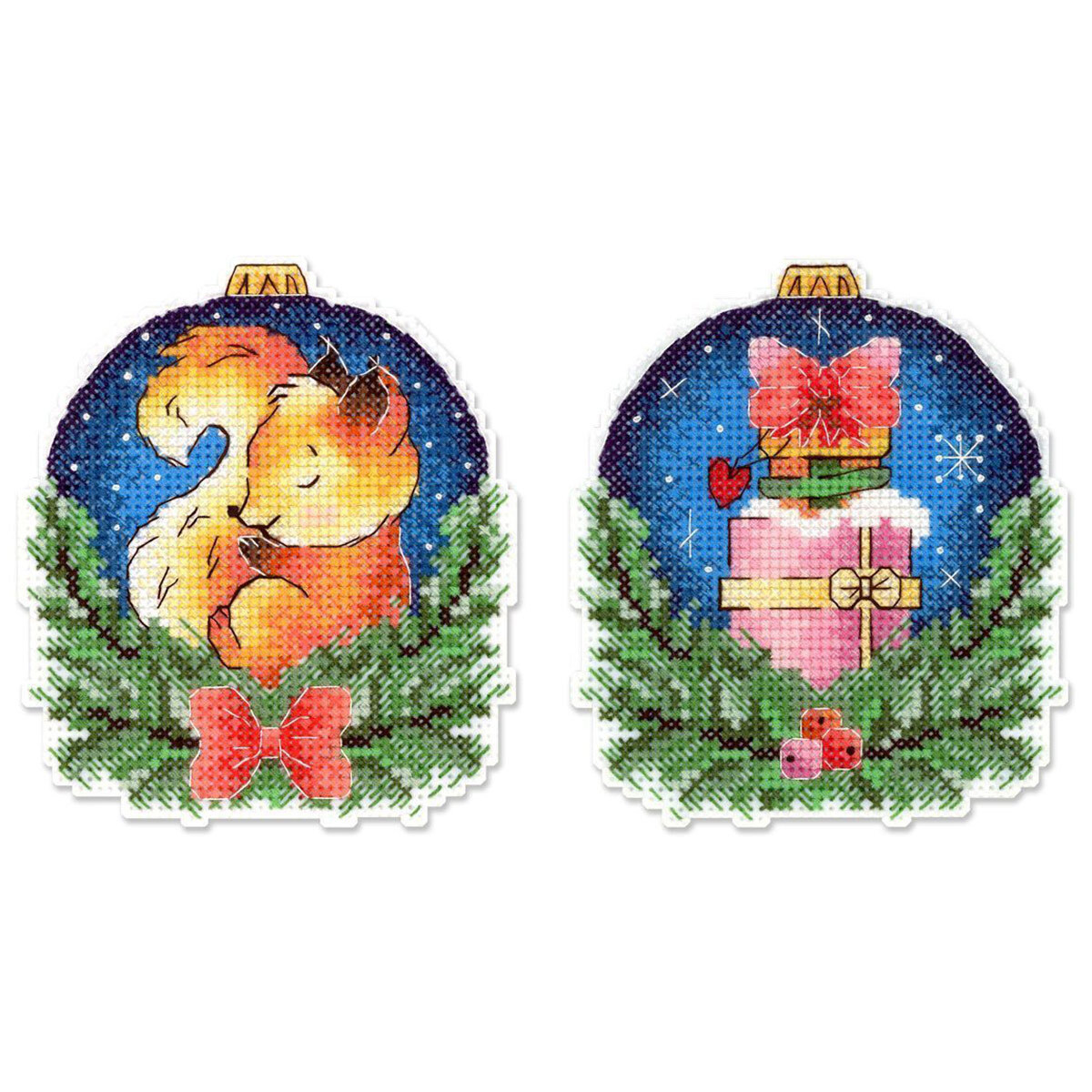 Набор для вышивания нитками МП Студия Р-1160, на пластиковой канве Новогодний шар с белочкой, 10х9 см
