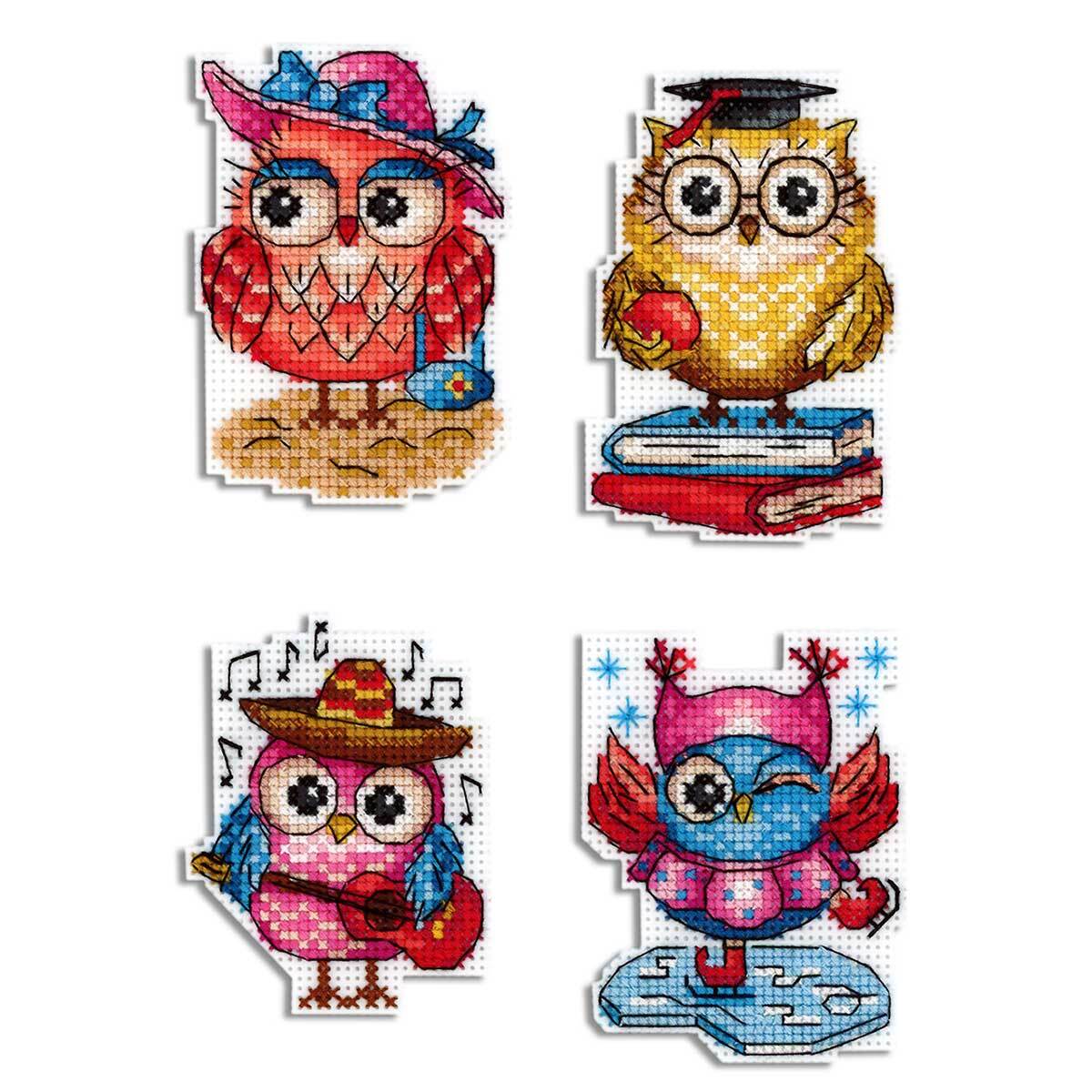 Вышитые магниты 'Совиные истории' на холодильник – это оригинальные сувениры и превосходный подарок. Чтобы сделать такой сувенир, достаточно владеть техникой 'крест'. Пяльцы или рамки не понадобятся – пластиковая канва отлично держит форму. Готовые элементы надо вырезать по контуру. К оборотной стороне фиксируется фетр, который маскирует изнанку, и затем фиксируется магнитное полотно. В наборе: пластиковая канва 14 каунта, нитки мулине, фетр белого цвета, магнитное полотно, схема, инструкция. Количество цветов: 24. Размер готового сувенира: 7х6 см.