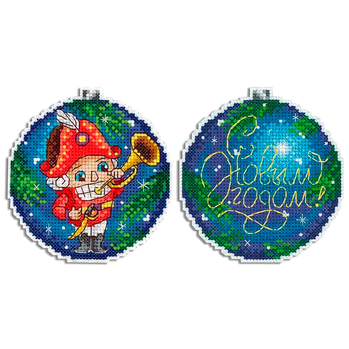 Сделайте своими руками яркую подвеску на елку 'Пора праздновать' – это увлекательно и быстро. Набор подойдет даже начинающим, достаточно проявить терпение, аккуратность и освоить простую технику 'крест'. Пяльцы или рамки не понадобятся – пластиковая канва отлично держит форму. Готовые элементы надо вырезать по контуру и соединить между собой аккуратными стежками. При желании между деталями игрушки можно вклеить или вшить ленту-подвес. В наборе: канва пластиковая Aida №14, нитки мулине, разобранные на органайзере, игла, схема и инструкция. Количество цветов: 26. Размер готового сувенира: 9х9 см.