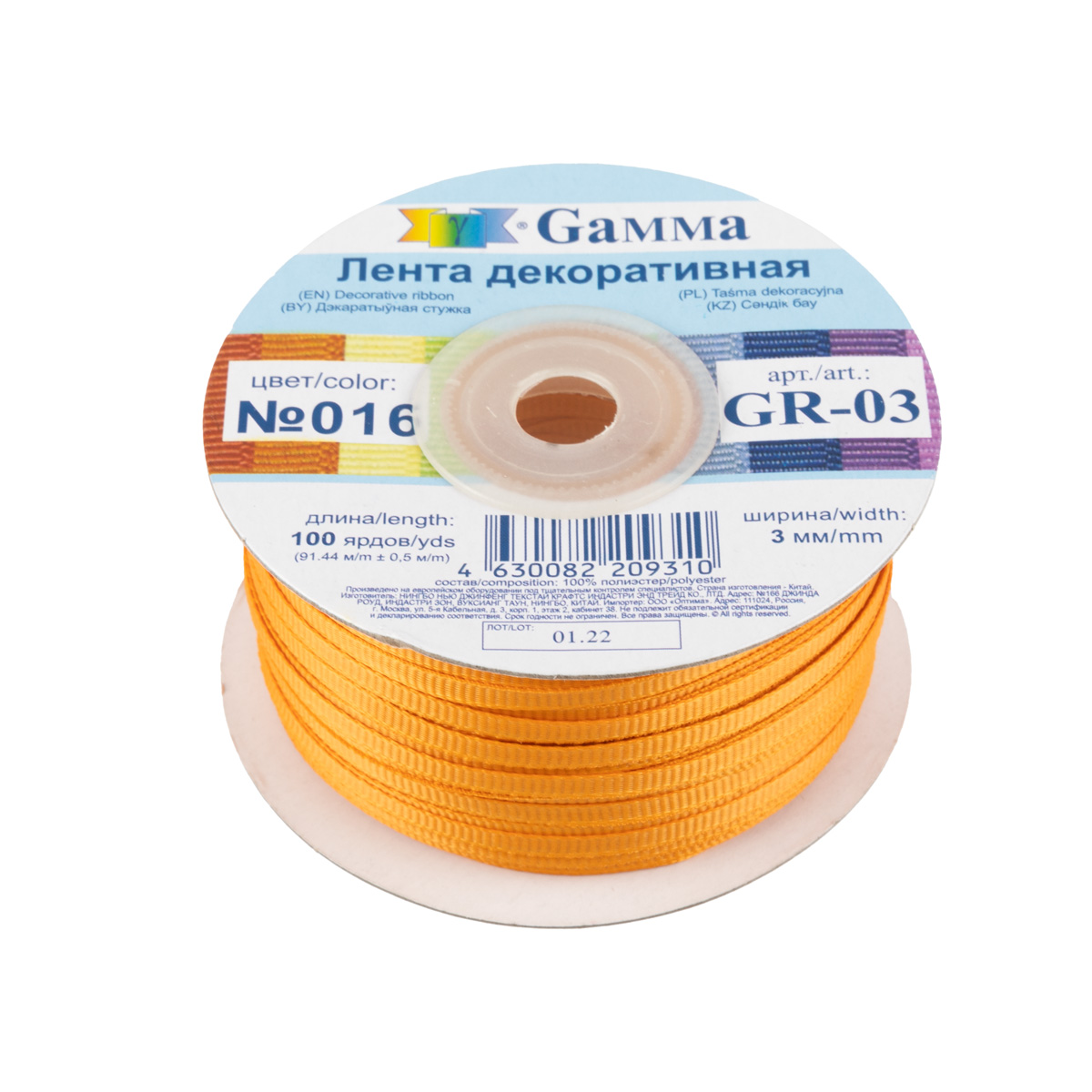 Лента репсовая (в рубчик) _3.0 мм / 91.44 метра, 016 т.оранжевый, Gamma GR-03