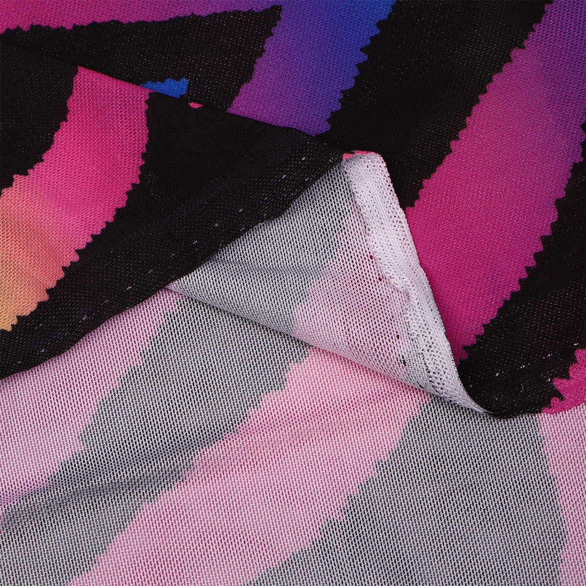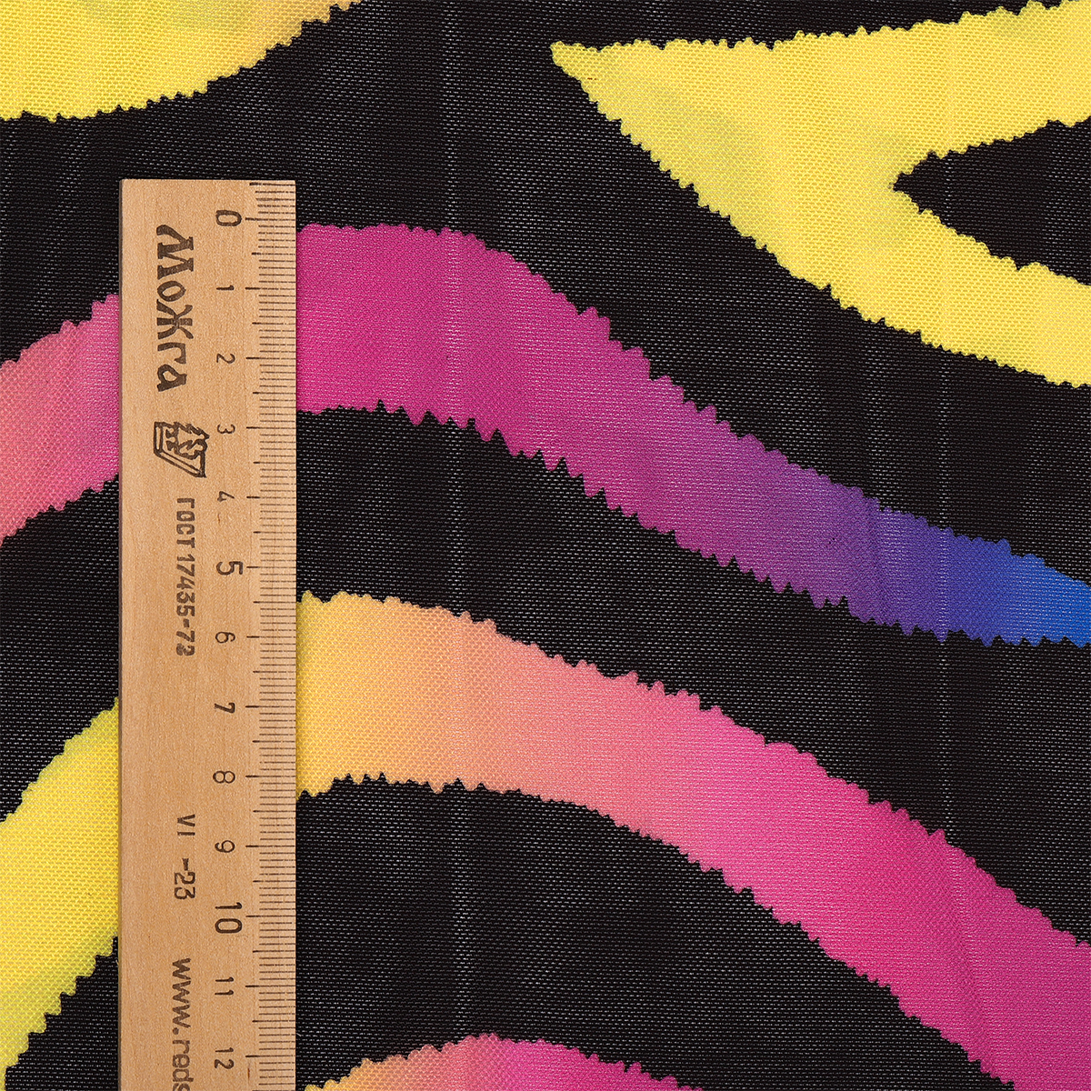 Эластичная сетка с цветным принтом. Позволяет получить интересный эффект. Очень приятная на ощупь. Мягкая и упругая. Идеальна для изготовления топов, водолазок, летних платьев и юбок, а также декорирования спортивного костюма и пляжной одежды, аксессуаров.