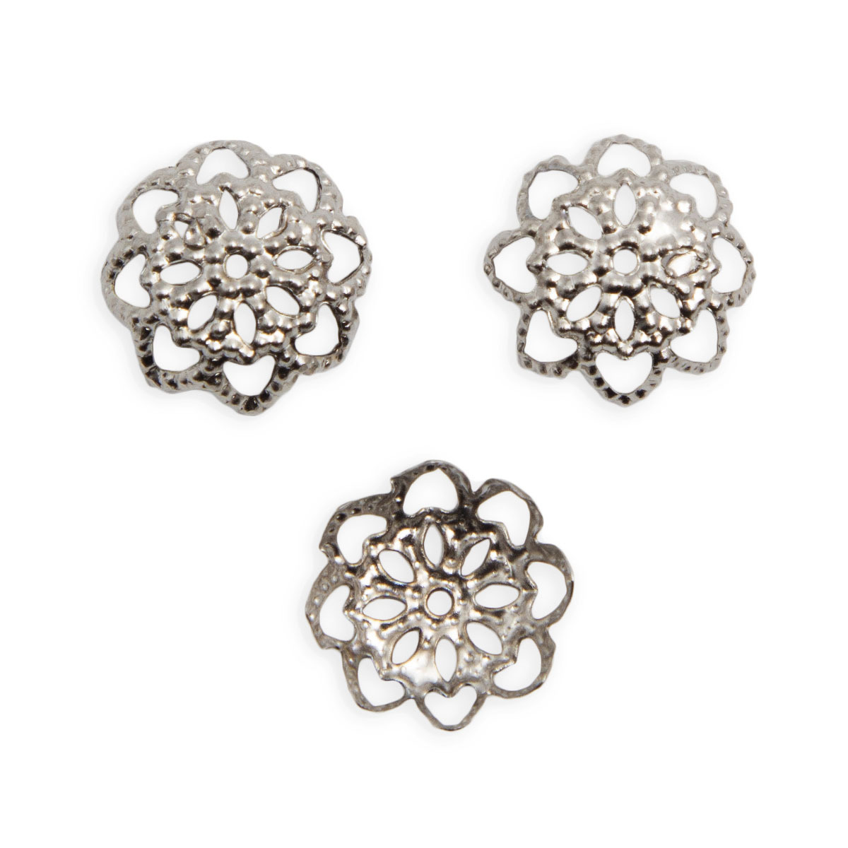 Фигурные элементы – 'шапочки' позволяют сделать украшение более нарядным, разделить ряд бусин, а также зафиксировать элементы в желаемом положении. Кроме того, с их помощью можно утяжелить ряд из легких украшений, например, пластика. Используются при создании сережек, колье, брошей и другой бижутерии. Изготовлены из металла, сохраняют цвет, защищены от коррозии, устойчивы к стандартным нагрузкам. Металлические элементы удачно сочетаются с изделиями из других материалов, например, цветного стекла или акриловой смолы. Как использовать: наденьте 'шапочку' на бусину перед нанизыванием на леску. Размер одной шапочки: 11 мм. Количество в упаковке: 50 штук.