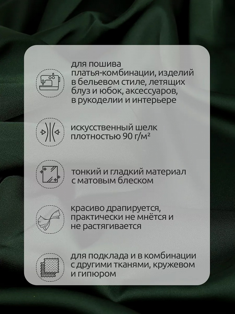 Армани шелк (искусственный шелк) - это синтетическая плательно-блузочная ткань, тонкая и нежная. Имеет приятную гладкую поверхность с матовым блеском, немного тянется в ширину полотна. Полотно с двойным прокрасом, что улучшает технологические качества материала. Ткань красиво и легко драпируется, способна образовывать даже очень мелкие складки. Особенностью ткани является её близкое сходство по внешнему виду с натуральным шёлком. Идеален для пошива изделий в бельевом стиле и вечерних платьев, блузок, юбок, костюмов. Кроме того, это хороший вариант подклада под шифон, кружево или гипюр, используется для изготовления палантинов, платков и шарфиков. Светлые оттенки немного просвечивают.