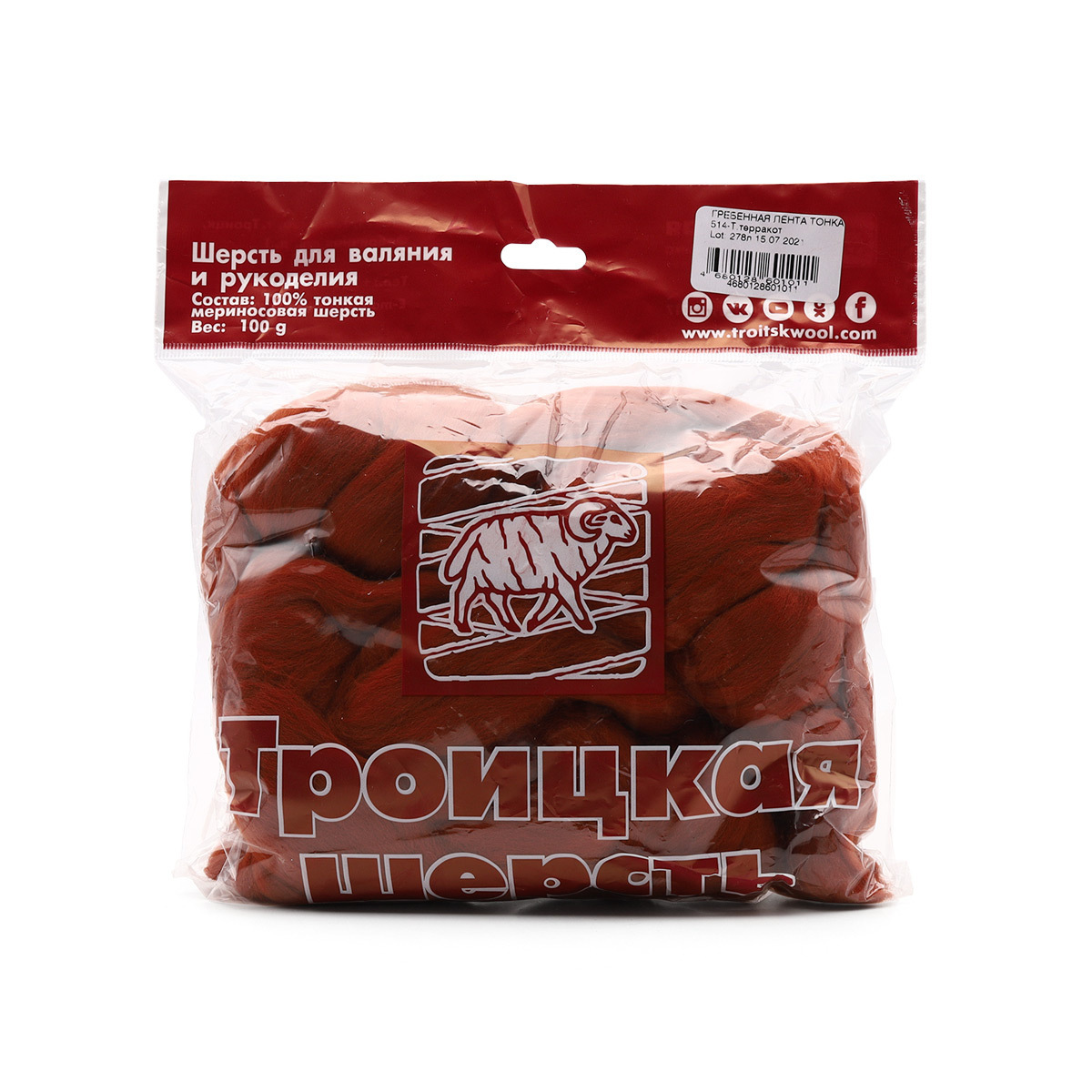 Шерсть для валяния мериносовая тонкая 100%, 100 г, цв.514 темный терракот