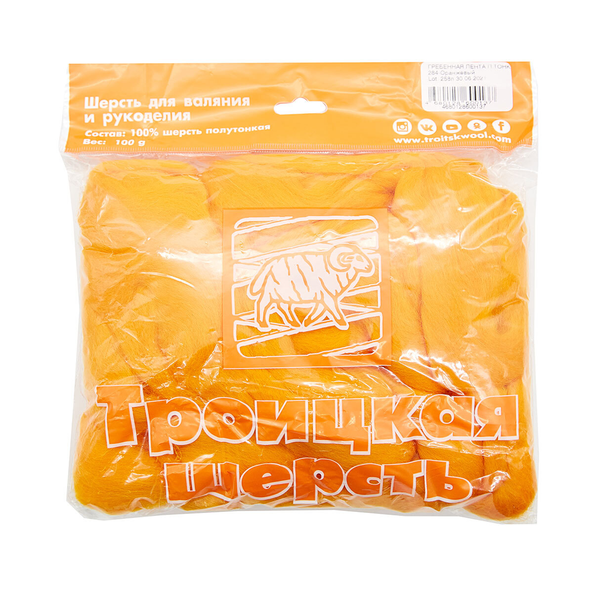 Шерсть для валяния Троицкая п/тонкая 1х100 г (до 29 мкр), 284 оранжевый