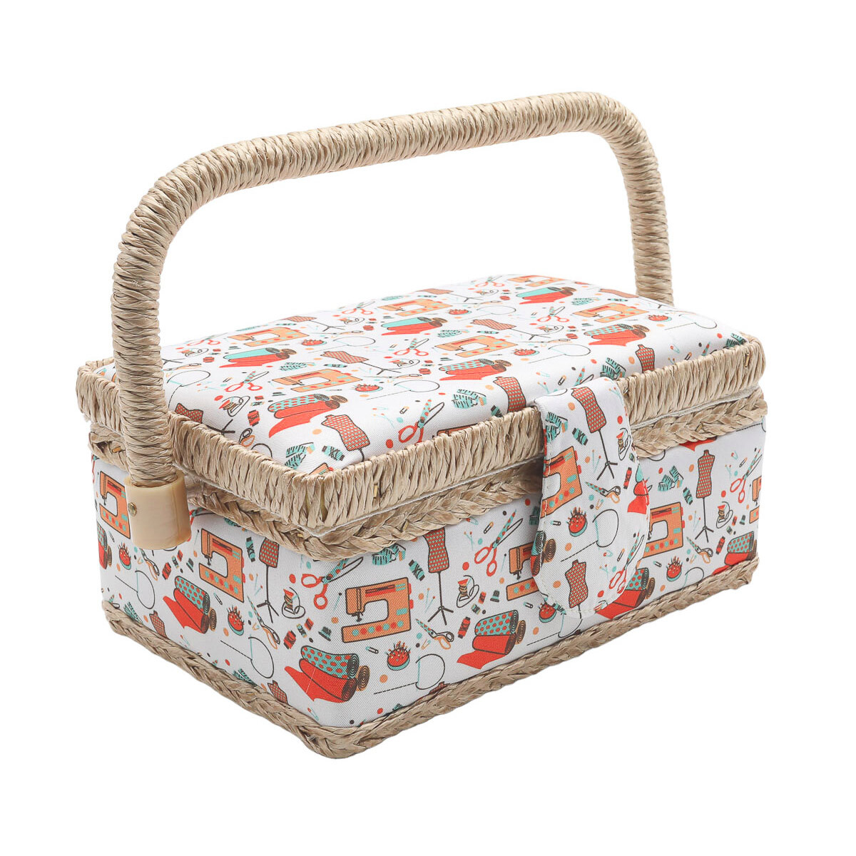 Шкатулка декоративная для рукоделия - это настоящая находка для каждого, кто любит творить своими руками. Она станет вашим верным помощником в организации материалов, инструментов и аксессуаров для шитья, вязания, вышивания, скрапбукинга или любого другого вида рукоделия. Если вы собираетесь на курсы кройки и шитья или отправляетесь в творческое путешествие - просто возьмите с собой легкую и вместительную шкатулку. Она не только освободит ваши руки, но и позволит сохранить все необходимое в порядке. Прямоугольная шкатулка c практичной магнитной застежкой понравится всем, кто ценит функциональность и эстетику. Внутреннее пространство шкатулки продумано до мелочей. Извлекаемая пластмассовая вставка с отделениями позволяет разделить ваши принадлежности по группам: иглы, пуговицы, маркировочные карандаши, катушки ниток – все найдет свое место. Но это еще не все! С нижней стороны крышки шкатулки пришиты игольница и тканевый карман. В нем удобно хранить ножницы, измерительные ленты, линейки, ножницы и другие инструменты, которые всегда должны быть под рукой. Шкатулка обтянута прочной тканью, украшенной принтом с милыми деталями из мира шитья и рукоделия. Размер: 19,5x13x9,5 см.