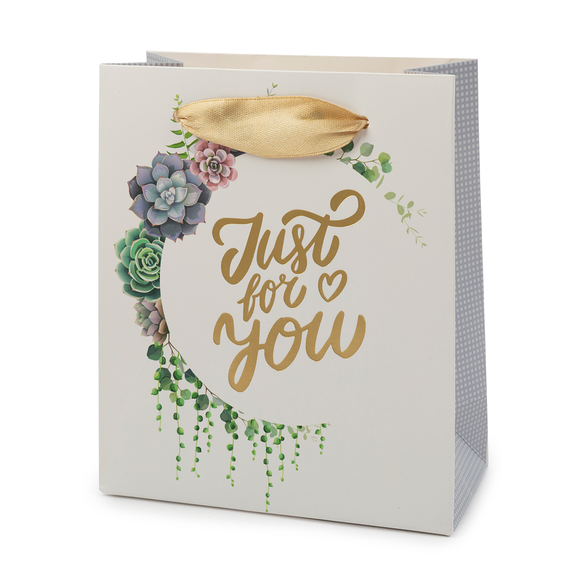 Выполнен из плотной бумаги 210 г/м², для удобной переноски на пакете имеются две ручки из атласной ленты.