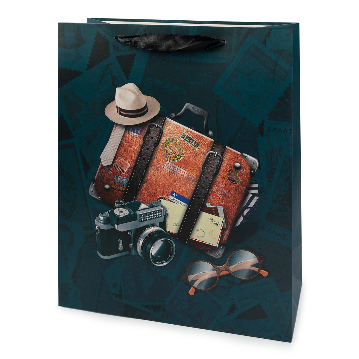 Выполнен из плотной бумаги 210 г/м², для удобной переноски на пакете имеются две ручки из атласной ленты.